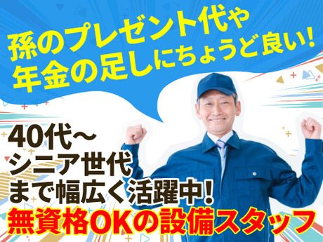 資格 未経験さん大歓迎! 無資格OK!学歴不問! 年齢不問!ミドル世代~シニア世代まで幅広く活躍中! 特に資格がいるような難しい作業はありません! 経験者の方も大歓迎! 特に、施設管理の経験のある方は即戦力として活躍可能です! 長期で無理なく働いて年金の足しにしたい方にもピッタリ!