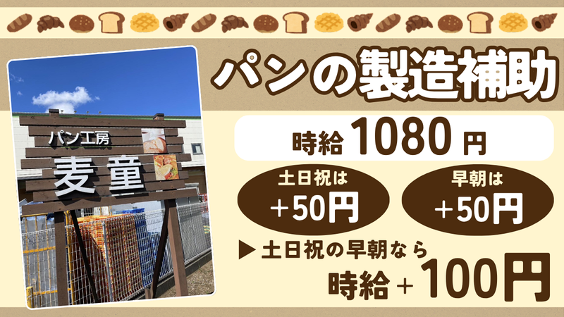 仕事内容 焼きたてのおいしさを提供する 「パン工房 麦童」 にて製造補助スタッフを募集!! 【パンの製造補助】 ・パンの生地作り ・仕上げ などの製造補助をお任せします。 (※25kgの粉袋運搬作業があります) 食品製造の経験がなくてもOK! お仕事は丁寧にお教えしますので 未経験の方でも安心して始められます。 <<パンの種類は100種類以上!>> もっとお客様に美味しいパンをお届けしたい という気持ちでパンを作り続け、 その数は100種類以上に!! 安全な材料選びに努め まごころを込めて作るパンは 地元のお客様に長年愛されてきました。 これからも地元に愛され続ける 美味しいパンをお届けする為 一緒にお店を盛り上げてくれる 仲間を募集致します!!