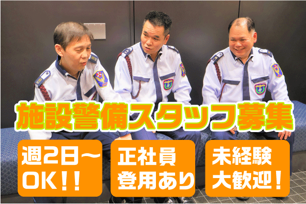 仕事内容 ----------------- 警備スタッフ募集! ⭐知識・経験不問⭐ ----------------- 受付、巡回、施解錠業務をお任せします。 丁寧な指導・教育があるので、 未経験の方も安心してご応募くださいね。 ★勤務日数は週2日~相談OK! ★正社員登用あり! 長く働きたい方にもオススメ◎ ★交通費月額上限10万円まで♪