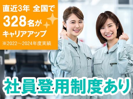 【保険制度】 雇用保険、労災保険、健康保険、厚生年金 待遇・福利厚生 【福利厚生】 ・各種社会保険完備 (厚生年金/健康保険/雇用保険/労災保険) ・交通費全額支給 ・指定作業服一式貸与 ・有給休暇制度 ・産休/育休制度(規定有) ・正社員登用制度有 ・雇入/定期健康診断 ・他、福利厚生サービス利用など ★当社の社員登用実績 2022~2024年度の3年間 全国で328名がステップUPしています♪(2024年度は99名登用!) ★昨年度の産休・育休取得実績:114名(2025年3月時点)