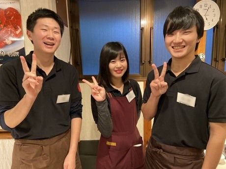仕事内容 丁寧な研修やマニュアルが整っているので、アルバイト未経験でも安心です! 料理のオーダーとり、配膳、料理の説明、下膳、会計、清掃などが主なお仕事です。 ビールの注ぎ方やハンディでの注文のとり方も丁寧に教えるから未経験でも大丈夫! 元気な挨拶や笑顔の対応がとっても大切☆最高の接客でお客さまをおもてなししよう★ 楽しい仲間が待ってます!友達と一緒にバイトするのもイイね★ 10代~50代まで、幅広い年齢の仲間が集まってワイワイ楽しく仕事をしています! 高校生、大学生から主婦・主夫、フリーター、学生も活躍中★ スタッフ同士の飲み会やイベントも沢山あるから、刺激のあるアルバイト生活ができますよ!! もちろん友達同士での応募も大歓迎です! 働き方もいろいろです 学生や主婦・主夫が大活躍中!授業の合間や家事の合間に働いています。アルバイトとの両立もご心配なく。 テスト期間や子どもの急な体調不良など、急な予定が入ったら優しい店長へご相談を!なんとかします!笑 みんなで楽しく働きましょう!