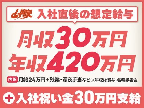 仕事内容 \ 最短1年で店長へ / 飲食経験者歓迎(ジャンル不問) ** キャリアアップを目指す方必見! ** 業界屈指の安定基盤を誇る《丸千代山岡家》で、 「1~2年後に店長」を目指して働きませんか! ★らーめん店の経験がなくても大歓迎です!! <店長:月給43万円~> <ミドル店長:月給46万~60万円> ====================== 成長加速&エリア拡大中に伴い、 正社員を“積極採用中”!(2024年実績:180名以上) ====================== SNSやメディアで日々話題になる山岡家のラーメン。 ―でも、選ばれているのはラーメンだけではありません! 実は「働く場所」としても多くの人に支持され、 30~40代で転職した男性社員も多数活躍中! 現在は、西日本エリアで幅広く出店が加速中! 2026年も成長スピードはさらにアップします!! \ 四国初進出! / 4月3日、香川県に「高松中央インター店」がオープン予定! \ 博多区にも出店 / 4月22日、九州福岡に「福岡月隈店」がオープン予定! 福岡市内2店舗目、博多区初出店です!! 【スムーズに業務を始めていただくために…】 入社後は、茨城県つくば市にある自社の トレーニングセンターで研修を実施(3泊4日) ※研修中の交通費・宿泊費は全額会社負担! ※研修中もしっかり給与支給で安心スタート ====================== \ここがポイント/ 1)最短1年で「店長」へキャリアアップも可  ̄ ̄ ̄ ̄ ̄ ̄ ̄ ̄ ̄ ̄ ̄ ̄ ̄ ̄ ̄ ̄ ̄ ̄ ̄ ̄ ̄ 《昇進例》 ◆一般社員・・・・・【年収420万円/月給24万円】 ◆アドバンス社員・・【年収470万円/月給28万円】 ◆店長・・・・・・・【年収580万円/月給43万円】 頑張りがそのまま昇進に繋がるのが “山岡家”。 評価制度が明確で着実に仕事を覚えられるから、 未経験者も3年で店長になる社員が多数! ★経験者なら、よりスピード昇進が可能!! ★その後もエリアマネージャーや幹部候補、 本社スタッフ、スーパーバイザー(SV)など、 多彩なキャリアパスをご用意しています! 2)東証スタンダード上場企業の安定基盤  ̄ ̄ ̄ ̄ ̄ ̄ ̄ ̄ ̄ ̄ ̄ ̄ ̄ ̄ ̄ ̄ ̄ ̄ ̄ ◎今なら!入社祝い金30万円支給!! ◎残業代は1分単位で全額支給(みなし残業なし) ◎昇給・賞与は年2回!! ◎特別休暇を合わせて、実質年休111日! ◎有給平均取得日数7.5日(土日取得もOK!) ◎プライベートの都合に配慮したシフト希望休OK ◎女性だけでなく、男性社員の育休取得実績あり ◎20年以上活躍する社員も在籍する定着率の高さ ====================== 【お仕事について】 ゆくゆくは店長として、 アルバイト採用やスタッフ教育などの人材育成、 売上・利益率の管理、月次損益書の作成、 自店舗の目標達成に向けた運営戦略の立案・ 実行などをお任せしたいと考えています! <入社後の流れ> まずはホール業務からスタート! お店全体の流れや雰囲気をつかみます。 ▼ キッチン・洗い場・仕込みなども習得! 冊子のマニュアルや、店舗タブレットでも 視聴できる動画教材があるのでスムーズ! ▼ 店舗全体の流れを理解したら、 スタッフ育成や売上管理、発注業務など 店舗運営の中核を担うポジションへ。 ▼ 店長として、運営業務を一任します! ※接客・マニュアル・動画はすべて日本語です。 ※また、衛生記録なども日本語で記入します。 ・・・・・・・・・・・・・・・・・・・・・・ <店長インタビュー:30代・男性・ミドル店長> ・・・・・・・・・・・・・・・・・・・・・・ Q.【山岡家を選んだ決め手は?】  ̄ ̄ ̄ ̄ ̄ ̄ ̄ ̄ ̄ ̄ ̄ ̄ ̄ ̄ ̄ ̄ 店長に運営を任せるスタイルに魅力を感じました! セントラルキッチンを持たずに、 仕込みからすべて店舗で手作りしている 山岡家のラーメンが大好きだったことも理由です。 今では自分で判断できる領域が広くなり、 経験を積むほどお店づくりが面白くなっていますね! Q. 【店長としてのやりがいは?】  ̄ ̄ ̄ ̄ ̄ ̄ ̄ ̄ ̄ ̄ ̄ ̄ ̄ ̄ ̄ ̄ 人を育て、“強い店”をつくれることです! 特に新店の立ち上げはゼロから組み上げる分 大変ですが、その分やりがいが大きいですよ。 スタッフたちと積極的に関って、楽しく働けるよう コミュニケーションを取ることを心掛けているので、 スタッフが成長する姿を見ると、 店長としての自分の仕事にも誇りを感じます! <異動も “成長チャンス” として全力サポート> 週休2日制の正社員には全国転勤がありますが、 山岡家の異動は「経験の幅が広がる機会」として活用。 新しい環境で視野が広がることで、 評価につながりやすい仕組みになっています! <転勤や研修も安心の制度あり!> *全国への転勤費用・引越し費用は全額会社負担 *異動に伴う帰赴任手当なども全てサポート! 【丸千代山岡家について】 全国に190店舗以上のラーメン店を運営中。 売上好調!前年比平均10%以上の成長率! 47都道府県への出店を目指し、新店OPENも続々。 セントラルキッチンを設けず 全店直営&店内手作りにこだわる姿勢で、 根強いファンもたくさんいます! リピート率はなんと75%超え!(自社調べ) <売上高> 186億7600万円(2023年1月期) 264億9400万円(2024年1月期) 345億8500万円(2025年1月期)*前年比130.5%! 《HP