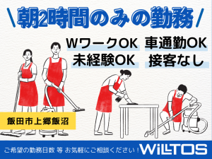インフォメーション お客様がいない時間帯に朝2時間だけのお仕事!朝活感覚で隙間時間にお仕事しませんか?未経験者活躍中! ☆週2日以上勤務いただける方大募集!もちろん勤務日数はご相談ください! ☆未経験者活躍中 ☆大学生・専門学生OK ☆シニア・主婦(夫)さん活躍中 ☆扶養内勤務可 ☆Wワークにピッタリ ☆チームでのお仕事 ☆労災保険完備 ☆受動喫煙防止措置あり ~~~~~~~~~~~~~~~~~~ お電話でのご応募も受け付けています!お気軽に、まずはお電話ください♪ 応募受付TEL 0120-160-086 ~~~~~~~~~~~~~~~~~~ アピールポイント ☆未経験者活躍中 未経験から始めたスタッフが90%以上! 研修も充実しているので安心して始めていただけます! ☆大学生・専門学生OK 講義の前に勤務すれば 放課後の時間は自由に使えます! 朝サクッといかがですか? ☆シニア・主婦(夫)さん活躍中 朝のお仕事なので プライベートや家事の時間をたっぷりとれます♪ ☆扶養内勤務可 ☆Wワークにピッタリ 朝に仕事が終わるので そのあと別の仕事もできます! 弊社の他の現場もご紹介できますので お気軽にお問い合わせください♪ ☆チームでのお仕事 チームで分担して清掃を行っており リーダーや担当社員もいるので 安心して働けます! ☆労災保険完備 労災保険に入れるので万が一のことがあっても安心! ☆受動喫煙防止措置あり 請負のお仕事なので勤務地での喫煙は禁止です。 当社は創設40余年。パートナー社員の方を中心に約850名の方が働いています。 パートナー社員の方々に支えられ当社もここまでこれました。 これからもたくさんのパートナー社員の方々と共に、お客様の利用される空間をより清潔で快適な環境を提供し続けていきたいと思っております。 皆様も是非ウィルトスで一緒に働きませんか?