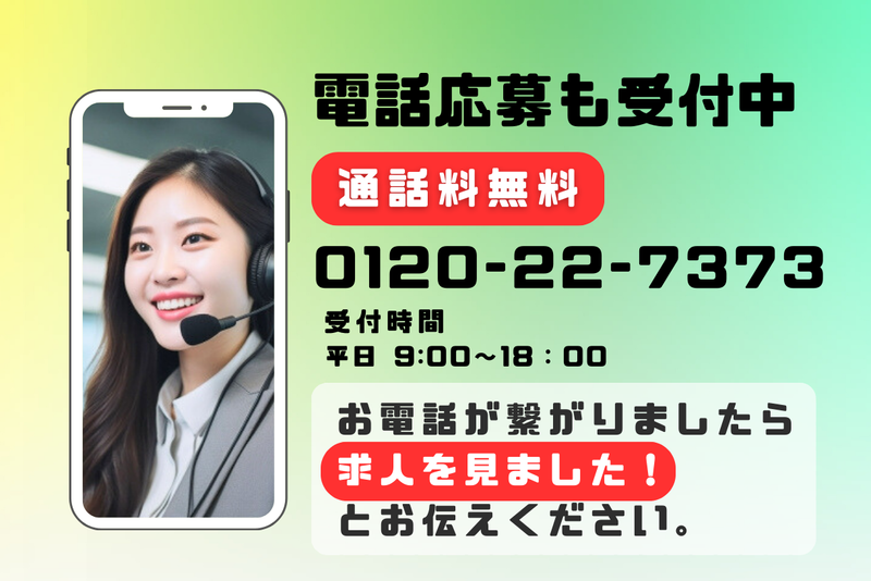 選考プロセス 応募するボタンをクリック ↓ 3営業日以内に弊社からメッセージまたは電話にて ご連絡をさせて頂きます。 メッセージのチェックをお忘れなく(*^^)v 書類選考 (結果は1週間以内にご連絡いたします。) ↓ 面接(約30分) ※ご希望に合わせて電話面接もOK! ↓ 入社手続き(約1時間) 書類記入や入社前教育を行います ↓ ※入社※ 最短で1~1.5週間で入社が可能です。 入社日の調整も可能!面接時にご相談ください♪ 求人番号:ko-8755902