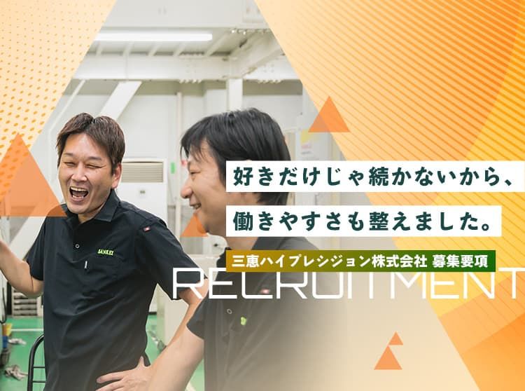仕事内容 ほとんどの社員が未経験からスタート! 金属加工の専用機械をマスターして 一生モノの経験と資格を手に入れよう ー ⇒ 個人の理解度に合わせた研修 ⇒ 資格は100%会社のお金で取得できる ⇒ 毎年昇給あり&賞与は最大年3回 ⇒ 家族手当・責任手当など福利厚生充実 ⇒ 1か月の残業10h以下&年休115日 ー ▼ 主な業務 ▼ マシニングセンタやCNC旋盤などの工作機械で 金属を加工し、半導体の生産設備や 電気自動車に使う精密部品を作ります。 ▼ 経験ゼロでもOK ▼ 38名のスタッフのほとんどが未経験入社! 実際の業務に携わりながら先輩が指導します。 個人に合わせて作業を教えていくので、 自分のペースで仕事を覚えられます。 三恵ハイプレシジョン株式会社について  ̄ ̄ ̄ ̄ ̄ ̄ ̄ ̄ ̄ ̄ ̄ ̄ ̄ ̄ ̄ ̄ ̄ ̄ 1967年から続く精密切削加工のノウハウで 多くの信頼と実績を獲得した安定企業。 種類豊富な加工機のほか、自社開発の研磨機も有し、 顧客の様々なニーズに対応しています。