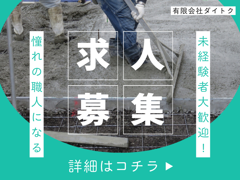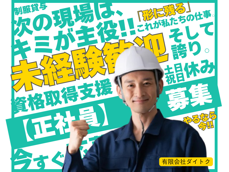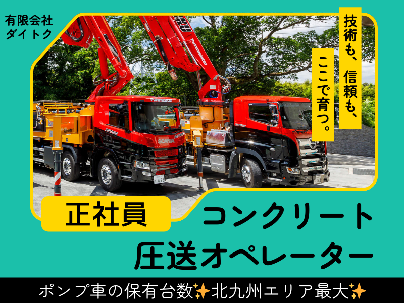 仕事内容 ◤◢◤◢◤◢◤◢◤◢◤◢◤◢◤◢◤◢ ⭐コンクリートの圧送作業スタッフ⭐ 建物の基盤を支え、街の未来を築く。 「形が残る」やりがいのあるお仕事です! ◤◢◤◢◤◢◤◢◤◢◤◢◤◢◤◢◤◢ 当社は、福岡県北九州市八幡西区に拠点を置き、 福岡県を中心に九州一円の現場にコンクリート圧送を行っています。 今回は体制強化に向けて、新しい仲間を増員募集いたします! ※当社は、上村建設株式会社の協力会社で構成する組織「上栄会」の一員です。 工事施工および安全衛生管理の面で協力しながらともに成長を続けます。 ” https://www.u-buddy.net/company/member75/ \\ お仕事ポイント // ⭕北九州エリア最大!ポンプ車の保有台数No.1★ ⭕未経験から始められる! ⭕頑張りは「成果給」でしっかり評価! ⭕完全週休2日制/年間休日112日 ⭕丁寧な研修・フォロー体制あり \\ 経験者も未経験者も大歓迎 // 制服(作業着)、安全靴、工具は会社で支給します。 ”どんなものを用意したらいいかわからない…。” ”お金をかけたくないけど、安物も不安…。” など 悩む必要も事前準備も必要もありません。 あなたの新しい挑戦を応援いたします! 【 仕事内容 】 コンクリートの圧送作業をお任せします。 現場は福岡県がメインです。その他九州一円、山口県などもあります。 <圧送とは?> ミキサー車から受け取った固まっていない生コンクリートを、 ポンプ車を使って工事現場や建設現場の型枠に流し込む作業です。 枠組みに流した後は、コンクリートの形を整え、仕上げていきます。 時には、現場の状況に合わせてポンプ車のアームを巧みに操作したり、 ホースの延長や分岐を行ったりと、柔軟な対応が求められます。 1人が全部を担うのではなく、チーム全体で協力して作業するので、 経験が浅い方や未経験の方もご安心ください◎ 高層ビルの上層階や狭小地での住宅基礎工事、あるいは橋梁やトンネルなど、 様々な現場でコンクリートを必要とする場所があります。 色んな現場に携わり、経験を積んでいきましょう! 自分の可能性を最大限に引き出し、新しい技術に触れるチャンスです★ まずはお気軽にお問い合わせください! ───────────────── ⭐ 未経験からでも安心の教育体制⭐ ───────────────── 新入社員が一人前のプロとして活躍できるよう、 実践的なOJT(職場内訓練)に力を入れています。 経験豊富な先輩社員がマンツーマンで指導し、 コンクリートポンプ車に関する安全管理や操作方法など、 幅広い知識と技術を身につけることができます。 わからないこともすぐ聞ける環境なので、 未経験でも安心してスタートできますよ! ────────── ⭐ 職場の雰囲気 ⭐ ────────── ダイトクには、現場の悩みも休日の思い出も、 つい話したくなるフレンドリーな社員が集まっています。 孤独を感じさせない「相談のしやすさ」と、公私の垣根を越えたチームワーク。 この風通しの良さが、私たちの働きやすさの秘訣です。 ────────────── ⏩ 1日のスケジュール (例) ────────────── ▼ 8:00 出社・朝礼 作業スケジュールや業務内容を確認し、現場に移動します。 ▼ 9:00 作業開始 現場で他業種との打ち合わせ。安全確認と作業手順を共有します。 ポンプ車を固定し、配管を設置。生コンを型枠へ流し込む作業スタートです! ▼ 11:00 小休憩(30分) ▼ 13:00 お昼休憩(60分) ▼ 14:00 作業再開 午後の圧送作業を行います。 ▼ 16:30 片付け・洗浄 撤収作業や配管内に残った生コンの掃除を行います。 ▼17:30 帰社 日報作成、車両の清掃、翌日の準備 お疲れ様でした! ※現場によって、作業内容や休憩の取り方に変動があります。 ────────────── ⏩ 会社について ────────────── 当社は、主にコンクリートポンプ車を用いた生コンクリートの圧送・打設工事を行う専門会社です。 地域最大級の大型車両を保有し、高層ビルや公共インフラなどの大規模な土木工事から 個人住宅の外構(エクステリア)まで、現場の規模を問わず高い技術力で多彩な現場を支えています。 グループ会社の「株式会社大徳」と連携し、圧送から左官仕上げまで一貫して対応できる点も強みです。 確かな知識と技術を備えた専門スタッフが在籍しており、多様なニーズに合わせた万全の施工体制を整えています。