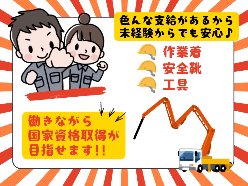 求めている人材 ✨人柄重視の採用です!✨ ⌒⌒⌒⌒⌒⌒⌒⌒⌒⌒⌒⌒⌒ ◎学歴・年齢・経験不問 ◎普通自動車運転免許(AT限定不可) < 下記の資格・経験をお持ちの方も大歓迎!> ★大型・中型免許、特殊自動車免許をお持ちの方 ★コンクリート圧送施工技能士をお持ちの方 ★コンクリート圧送作業、打設作業の経験がある方 ⭐⸜ 未経験OK!⸝⭐ *異業種からの転職者も多数活躍中! *20代・30代・40代活躍中! ⭐⸜ 資格取得支援あり!⸝⭐ 働きながら「特殊自動車免許」や 「コンクリート圧送施工技能士」などの 資格取得も目指せます! ⭐⸜ こんな方、お待ちしてます!⸝⭐ ◆建築業界、土木作業に興味がある方 ◆手に職をつけたい方 ◆やりがいのある仕事をしたい方 ◆チームプレーやコミュニケーションを大切にできる方 ◆「機械操作」や「乗り物」にワクワクする方