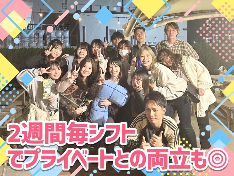勤務時間詳細 【平日】10:00~15:00、17:00~23:00 【土日祝】10:00~23:00 →週2日~、1日4時間~ *電車やバスの終電までシフトもOK! *短時間、フルタイム等ご相談ください。 *2週間毎シフト★Wワーク勤務も歓迎! シフトは月2回提出していただきます。 プライベートの予定と両立しやすい 柔軟なシフトも魅力のひとつ! 週2日~の勤務で自分の時間を 大事にして働きたい方も、 ガッツリ勤務でしっかり働きたい方も大歓迎です。 ラストまで入ってくれる人、大歓迎!! 出勤時間や退社時間の相談もOK!