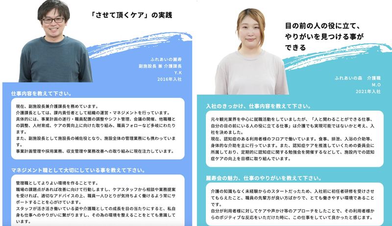 職場環境 ■男女比率 └男性35%、女性65% ■雇用形態比率 └常勤42%、非常勤53%、他5% ■介護福祉士の資格所持者 └208名中119名 ■新卒 卒業学部 └福祉系学部20%、 非福祉系学部80%