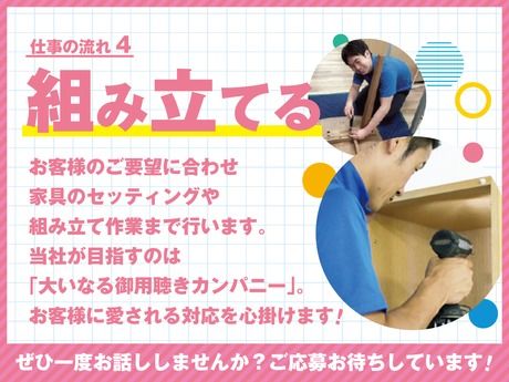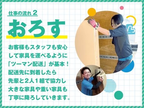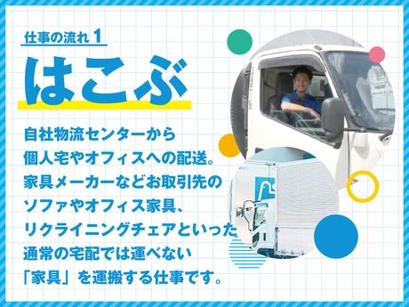 仕事内容 \月給30万円以上!未経験から年収450万も可能/ 年間休日120日&完全週休2日制の家具配送ドライバー助手 (20代・30代活躍中/40歳未満募集) 「運転は好きだけど、ドライバー経験はない…」 「しっかり稼ぎたいけど、休みも妥協したくない」 そんなあなたにこそ、知ってほしい求人です! 必要なのは普通免許(AT限定もOK)だけ。 《オススメポイント》 ・未経験でも入社1年目から年収450万円が可能! ・お休みは年間休日120日&完全週休2日制! ・賞与は昨年度実績77万円! ・平均年齢28歳!20代・30代が中心に活躍中です。 安定した環境で、新しいキャリアをスタートしませんか? 【具体的な仕事内容】 Q. どんな仕事? └ 2tトラックで、お客様(個人宅やオフィス)へ 机やソファなどの家具をお届けするお仕事です。 普段はドライバーの助手席に座っての移動なので、 安心して働けます。 Q. 未経験でも本当に大丈夫? └もちろんです!入社後は、まず先輩のトラックに同乗し、 荷物の運び方やお客様対応、ルートなどを覚えることからスタート。 ※ドライバーの急な体調不良などがあった場合に 運転をお願いすることがありますが それ以外は運転の必要はありません! Q. 家具って重そう… 体力的にキツくない? └ご安心ください!負担は最小限です。 軽いイス1脚から、重いダイニングセットまで様々ですが、 重さや大きさに応じて【必ず2名以上のチーム】で運びます。 一人で無理な作業はさせません。 <1日のスケジュール例> 8:00:出社・準備 点呼、アルコールチェック。 その日の配送ルートと、一緒に回るチーム(基本2名1組)を確認します。 ↓ 午前:積込み・配送 自社センターで家具をトラックに積み込み、配送へ出発。 (1日の配送件数は平均5~7ヶ所程度) ↓ お昼休憩:しっかり1時間リフレッシュ! ↓ 午後:配送・搬入 家具を丁寧に搬入・設置します。 お客様とのコミュニケーションも大切な仕事です! ↓ 17:00:帰社・退勤 センターに戻り、簡単な事務作業や翌日の準備をしたら「お疲れ様でした!」 ※残業が発生した場合も、もちろん時間外手当を全額支給します。 夜間配送は一切なし! 日勤のみなので、 現在夜勤がある方で健康的な生活を送りたい方にもおすすめ! 【当社の魅力トップ3!】 ◆魅力 1:未経験でも【しっかり稼げる】 月給 30万3800円~スタートをお約束! 入社1年目でも年収450万円が可能。 (年収例:450万円/月給30万3800円+賞与+諸手当) 賞与は年2回!昨年度実績は77万円と高水準です。 ◆魅力 2:業界トップクラスの【働きやすさ】 ・年間休日120日(3月より導入!) ・完全週休2日制(シフト制ですが連休取得もOK) ・GW・夏季・冬季には長期休暇もしっかり取れます。 有給消化率も高く(平均10日以上)、プライベートも充実できます。 ◆魅力 3:手厚い【サポート体制】 免許取得を会社が応援! 「準中型」「中型免許」の取得費用を会社が8割負担します。 取得後はさらに給与アップ! 運転できるトラックの幅が広がり、あなたの市場価値も高まります。 充実の研修制度 安全運転ミーティングや、 現場スキルを高めるための研修(「一心塾」)などを 定期開催し、あなたの成長をバックアップします。