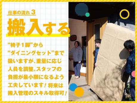 勤務時間 総労働時間:1ヶ月あたり176時間 8:00~17:00(実働8h/休憩1h) 平均現場数5~7ヶ所程度 ※軽いものだとイス1脚から 比較的重いものだとダイニングセット、 リビングセットなどを運搬します。 重量によって、人員も調整しており、 負荷が最小限になるように、 スケジュールを組んでいます。