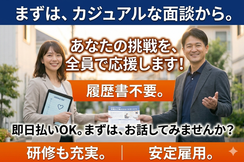 仕事内容 担当エリアのご家庭を訪問し、 公共サービスに関する制度のご案内や 手続きサポートを行うお仕事です。 専用端末に表示される訪問リストをもとに、 対象となるご家庭へ順番に訪問します。 制度の内容をご説明し、必要に応じて パンフレットのご案内や 手続き方法の説明を行います。 その場で手続きを希望される場合のみ、 専用端末を使って 簡単な手続きサポートを行います。 無理に契約をお願いするような 強引な営業ではなく、 制度の内容を丁寧にご案内することが 中心のお仕事です。 ■具体的なお仕事 主に以下の業務を行います。 ・対象となるご家庭への訪問 ・制度のご説明やご案内 ・パンフレットや申込書の配布 ・お客様からの簡単な質問対応 ・専用端末への情報入力 ・不在時の案内票の投函 その場で手続きをされない場合でも後日に ・WEB申込 ・郵送申込 などで手続きされるケースも多くあります。 ■1日の流れ(例) ▼9:30 出社 その日の訪問エリアや訪問リストを確認 ▼10:30 外回り開始 担当エリアへ移動し、ご家庭を訪問 ▼12:00 昼休憩 ▼13:00 訪問再開 引き続き担当エリアを訪問 ▼17:30 帰社 訪問結果を専用端末へ入力 ▼18:00 退社 残業はほとんどありません ■訪問件数について 1日に100〜200件ほど訪問しますが、 平日日中はご不在のケースも多くあります。 実際にお話できるのは 1日10件前後になることが一般的です。 不在の場合は 案内票やパンフレットを投函し、 後日お客様ご自身で 手続きをされるケースもあります。 そのため、 その場で契約を取ることに こだわる必要はありません。 ■この仕事の特徴 ★ノルマはありません 契約件数のノルマはなく、 制度の内容を丁寧にご案内することが 大切なお仕事です。 ★外回り中心の仕事 担当エリアを歩きながら訪問するため、 体を動かす働き方になります。 ★業務の流れがシンプル 訪問リストに沿って行動するため、 仕事の進め方が分かりやすいのも特徴です。 ■服装について お客様に不快感を与えない範囲で ビジネスカジュアルでの勤務が可能です。 歩きやすい靴(スニーカーなど)で勤務できます。 ■未経験の方も安心 入社後は研修制度があり、 ・業務の流れ ・ご案内の方法 ・お客様対応 などを丁寧に学ぶことができます。 未経験からスタートした スタッフも多数活躍しています。 ■こんな方に向いています ・体を動かす仕事が好きな方 ・外回りの仕事に興味がある方 ・人と話すことに抵抗がない方 ・コツコツ取り組む仕事が好きな方 ・自分のペースで働きたい方