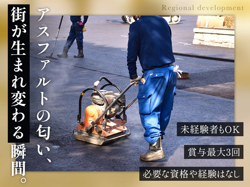 仕事内容 // 離職率0%の好環境で キャリアアップ! \\ 福岡市内を中心とした道路舗装・ 土木工事における現場作業全般を お任せします。 具体的には… ●アスファルト舗装作業 ●土木一式工事 ●コンクリート工事 ●現場での安全管理 など 公共工事が7割で安定感バツグン! 現場は6名のチーム制。 常に先輩が近くにいるので 未経験の方も安心です〇
