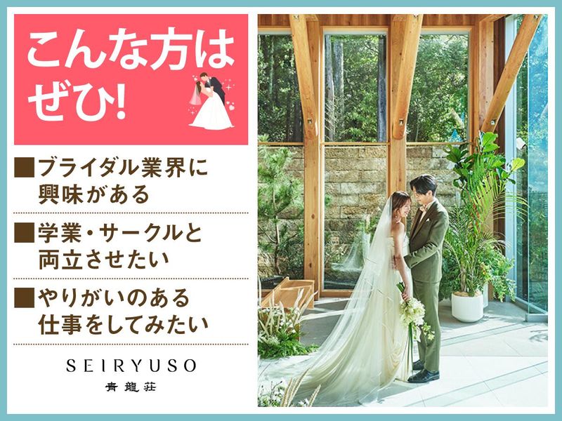 仕事内容 *木造チャペルのある和モダンな結婚式場* 感動いっぱいの結婚式を一緒にサポート♪ 授業やサークルのない日に勤務OK★ 「人が喜ぶ姿が好き」「サプライズが好き」 という方必見!スキルや経験は一切不要♪ 一緒に素敵な結婚式を演出しましょう* 青龍荘は 和モダンな邸宅の魅力はそのままに、 現代建築を融合した結婚式場。 ウェディングのお手伝いをするお仕事です◎ <主なお仕事内容は…> 結婚式場スタッフとして 次のお仕事をお任せ! ■会場の準備 ■お客様の上着や荷物のお預かり ■お席のご案内 ■結婚式のお料理・ドリンク提供 ―――――――――――――――― 学生が活躍中! オススメポイントはこちら★★ ―――――――――――――――― ・授業やサークルとの両立応援! ・週1日~1日5時間~OKで融通◎ ・絶品のまかないアリ(^^) ・同世代が多くて安心◎ まかないは本格料理人たちが 美味しい食材を使って作ってくれます♪♪ 4大・専門・短大の10代20代が多数在籍! お友達同士の応募も大歓迎です! 一度バイトを始めると長く 続けてくれる子が多数! 敷居が高いイメージがあるかもしれませんが みんなで協力しながら準備して… 毎日、文化祭みたいな雰囲気なんです♪ 素敵な仲間に出会える そんな場所になると思います◎ ついでに… 社会で活躍するためのマナーも学べますし、 実は就活に役立つのもうれしいポイント! ―――――――――――――――― 特別な1日をサポートするお仕事 具体的な仕事の流れは? ―――――――――――――――― ▶STEP.1 ミーティング 披露宴の流れやお料理について スタッフ間で事前に確認して 式中にバタバタしないようにします◎ ▶▶STEP.2 披露宴会場の準備 お席に置く名札や ゲストの方に渡す引き出物を確認したり グラスを磨いたりして準備します。 ▶▶▶STEP.3 お客さまのお出迎え 荷物をお預かりし、 待合室でドリンクをお出しします! ▶▶▶▶STEP.4 ホール業務 お席にご案内し、順番にお料理や ドリンクを提供します◎ ―――――――――――――――― 未経験者歓迎! みんなで助け合う雰囲気です ―――――――――――――――― 最初は結婚式の見学からスタート! 見学後は本番じゃないところで、 同世代を集めて研修を実施。 飲食業やホールスタッフが 初めての子には、 お盆の持ち方から教えます!