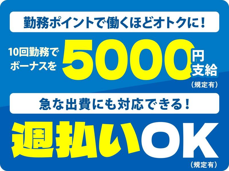 【保険制度】 雇用保険、労災保険 待遇・福利厚生 【福利厚生】 交通費規定支給(電車通勤代は全額支給、新幹線除く) 週払い(規定有) 食事支給(規定有) 10回の勤務ごとに5000円のボーナス支給(規定)