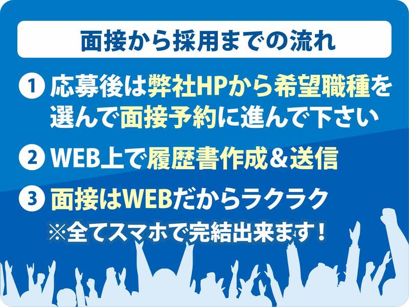選考プロセス 電話での応募やお問い合わせは行っておりません。 「応募画面へ進む」より応募後返信メールを確認ください。 <応募の流れ> 返信メール内URLより面接予約が必要です 「https://baito.sundayfolk-p.co.jp/」(株式会社エスエフオペレーション) ※こちらのURLからもOK お仕事選択後【静岡】⇒カレンダーから面接希望日を予約 ↓ 面接前日中までに履歴書作成・メールで送信 ↓ 面接当日! ◇登録後働き始めるタイミングはご自身のタイミングでOK◎ お気軽にご相談下さい。
