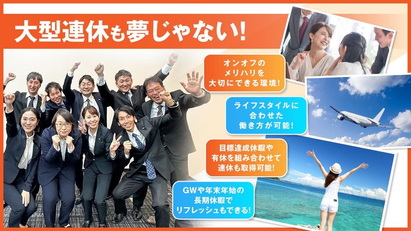 休日休暇 ✨大型連休も夢じゃない!✨ オンオフのメリハリを大切にできます 目標達成休暇を有給休暇や祝日と組み合わせて まとまった連休を取得することも可能です! GWや年末年始の長期休暇でリフレッシュする社員も多数♪ ・週休2日制(基本土日・祝) ・祝日 ・GW ・冬季(年末年始) ・有給 ・慶弔休暇 ・誕生日休暇(休日の場合は振り替え/規定あり) ・産前産後休暇 ・育児休暇 ・目標達成休暇(規定あり) ━━━━━━━━━━━━━━━━━━━━━━━━━━━━━