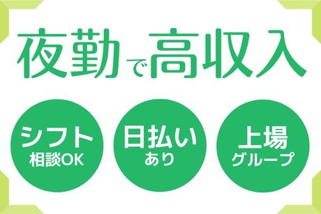 仕事内容 【こんなお仕事をお願いします】 \夜勤の介護スタッフ/ 週1日~OK!単発・スキマ時間でのお仕事もご相談ください☆ ▼食事、入浴、お手洗いのサポート ▼身の回りのお世話 ■具体的なお仕事内容 17:00 出勤/申し送り 17:30 夕食準備 18:00 夕食(食事介助/口腔ケア/服薬介助など) 20:00 就寝介助(排泄介助、更衣介助など) 21:00 消灯/定期巡回(コール対応・体位変換やオムツ交換など) 01:00 休憩 03:00 定期巡回(コール対応・体位変換やオムツ交換など) 06:00 起床介助(排泄介助、更衣介助など) 07:00 朝食準備 08:00 朝食(食事介助/口腔ケア/服薬介助など) 09:00 退勤/申し送り 利用者さんと一緒に笑顔になれる、とてもやりがいのあるお仕事です。 先輩スタッフがしっかりフォローするので安心してスタート出来ます 【業界最高水準の高時給】 上場企業グループ会社としてのネットワークと資金力を武器に、業界最高水準の高時給で安定して働いていただけます。また、独自のインセンティブ制度を用意しており、月収を大幅に上げる事が出来ます。 【オープニング大募集】 オープニングスタッフとして一緒に働いてくれる方を大募集中。また、営業責任者は業界歴20年以上のベテランですので、高い交渉力をもってあなたの理想的な職場環境を提供します。「家から近い職場で働きたい」、「夜勤専従で短期間にガッツリ稼いで、プライベートも充実させたい」、「曜日固定で働きたい」などご希望をお聞かせください。 【日払い・週払いOK】 日払い・週払いが可能です。急な出費等で緊急でお金が必要になった時もご心配ありません。振り込みの手数料も業界最安手数料でご利用いただけます。(振込手数料:セブン銀行55円、その他銀行165円。)