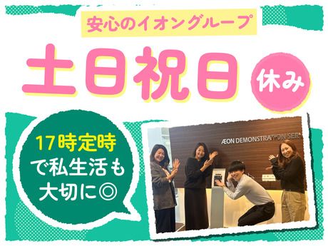 仕事内容 イオンデモンストレーションサービス株式会社は… スーパーやイベントでよく見かける、 「試食販売」などのお客さまと商品をつなぐ デモンストレーション事業を展開しています。 お店で試食販売スタッフが 商品の魅力を直接お客さまに伝え、喜んでいただく、 そんな光景を支える企業です。 あなたにはそんな弊社の営業推進部を支える 「本社事務スタッフ」として事務業務を幅広くお任せします。 バックオフィス業務ではありますが、 たくさんのスタッフを支える大切なお仕事! イオングループという安定感の中、 関わる様々なスタッフから「ありがとう!」をもらえる やりがいを感じながらお仕事しませんか? ///////////////////// <電話でのお問い合わせ> 03-6703-6963(採用担当)まで お問い合わせください。 ※受付時間9:00~18:00 ///////////////////// 【仕事内容】 イオンデモンストレーションサービス本社にて、セールスアシスタントとして活躍しませんか?PCは基本操作ができれば大丈夫!先輩スタッフが丁寧にサポートしますので、安心してスタートできます。 <具体的には> □システムへの受託案件登録・管理 □メーカー様への報告書の提出 □その他、SNSのイベント告知 など /////////////////// <アピールポイント!> *<何らかの事務経験のある方歓迎!> PCの基本操作や簡単な関数が使えればOK! *<土日祝休み&17時定時◎> 家族との時間や自分の時間を大切にできます♪ *<安定のイオングループ!> 充実した研修制度で新しいスタートをバックアップ! *<福利厚生・従業員特典も多数!> 毎日使えるお買い物割引や年に数回の従業員特別割引優待など! *<服装・髪型自由&ネイルOK> おしゃれを楽しみながら自分らしく働ける♪ /////////////////// <経験年数不問!> 「事務の仕事に復帰したいけど、スキルが心配…」 そんなあなたも大歓迎!エクセルの簡単な関数が使えればOKです。安心してスタートできるよう、丁寧な研修とサポートをご用意しています。困ったことがあれば、先輩スタッフがいつでもサポートしますので、ご安心ください。 /////////////////// <イオングループで長期安定!> イオングループの一員として、安定した環境で長く働くことができます。土日祝日休みで、勤務時間も9:00~17:00なので、家事や育児との両立も可能です。子育て世代も多く活躍しており、「子どもが熱を出してしまった...」など急なお休みにも対応可◎交通費支給、有給休暇、社会保険完備(週20時間以上の勤務の場合)など、福利厚生も充実しているので、ワークライフバランスを大切にしながら無理なく働きたい方、ぜひご応募ください! ///////////////////