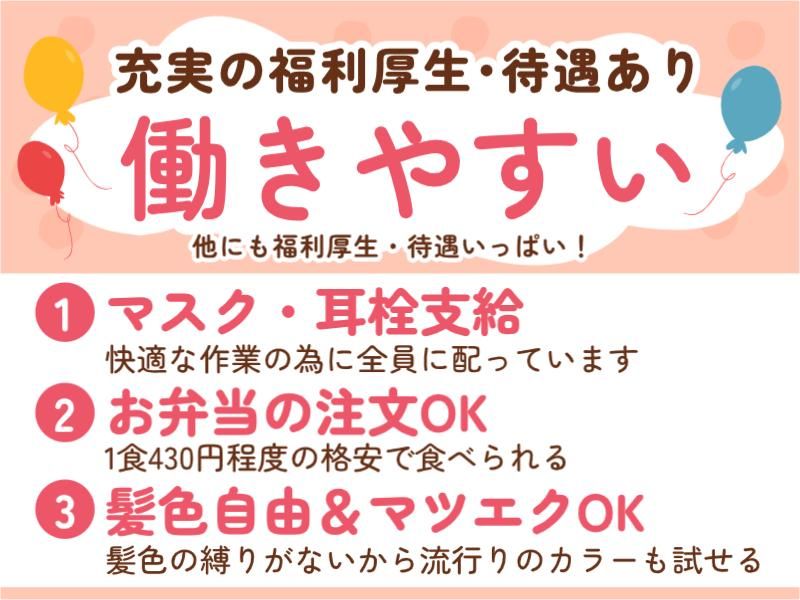 【保険制度】 雇用保険、労災保険、健康保険、厚生年金 待遇・福利厚生 【福利厚生】 社会保険完備 交通費規定支給(上限/月3万円) 有給休暇 資格取得支援制有(規定) 制服貸与 マスク・耳栓会社支給 車通勤OK 敷地内無料駐車場完備 住宅手配可 ⇒入社2・3週間後から入居可能 赴任費支給(規定) 正社員登用制度あり 髪色自由!マツエクOK 社員食堂あり 食堂の隣に喫煙所あり お弁当の注文OK(430円程度/1食) 【稼働分前払い制度あり(規定)】 専用アプリで簡単申請!最短、翌日振込可! 「急な出費」など、活用しているスタッフ多数!