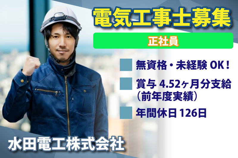 アピールポイント: 電気工事士スタッフ募集中! 当社は、道路照明や学校・公園などの公共施設を中心に、 地域のインフラを支える電気工事を行っている会社です。 近畿圏の公共案件を多く手がけており、 安定した仕事量のもとで技術を磨いていくことができます。 未経験からスタートできる理由 当社では、未経験の方も安心してスタートできる環境を整えています。 現場では先輩スタッフとチームで作業を行い、 工具の扱い方や図面の見方など 基礎から丁寧に教えていきます。 「手に職をつけたい」 「腰を据えて、長く働きたい」 そんな方にぴったりの環境です。 この求人のポイント ・未経験・無資格OK ・賞与年2回/計4.52ヶ月分(前年度実績) ・年間休日126日でしっかり休める ・公共工事中心で安定した仕事量 扶養手当・皆勤手当・現場手当など、各種手当も充実。 無理のない働き方で、長く続けられる環境です。 将来は“手に職”の技術者へ 資格取得支援制度を活用し、 第二種電気工事士などの資格取得も目指せます。 将来的には ・一人で現場を担当 ・施工管理へのキャリアアップ など、長く活躍できるスキルが身につきます。 地元・大津で技術を活かしませんか? 昭和40年代から続く地域密着の電気工事会社として、 公共施設や生活インフラを支える工事を手がけてきました。