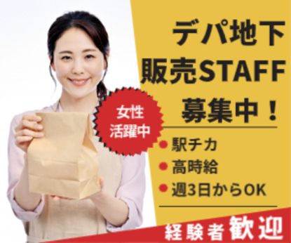 仕事内容 <駅チカの百貨店で販売STAFF急募> *店頭での接客販売業務 *レジ操作 *納品や片付け作業 *商品の在庫管理...など ◎百貨店で勤務経験がある方歓迎、デパ地下で勤務経験がある方尚可♪ ◎販売・接客経験を活かせます! ◎日払い・週払い制度もあるので急な出費でも安心☆ <オススメPOINT> ☆初日から時給1400円でしっかり稼げる! ☆交通費全額支給いたします ☆困ったときに安心の日払い・週払い対応可能(規定あり)! 「接客業の経験を活かして」 「洋菓子が好き」 「レギュラー勤務が希望」 など、スタッフの応募動機は様々です! <幅広い世代の女性スタッフ活躍中> 過去に百貨店でレジ経験がある方や、 接客販売経験のある方大歓迎! 経験を活かせるお仕事となっています☆ お仕事ブランクがある方もまずはご相談くださいね(^^)/ <フォロー体制が充実> 就業前・就業後も丁寧にフォローします。 不安なことがあっても、 すぐにコーディネーターに相談できます!