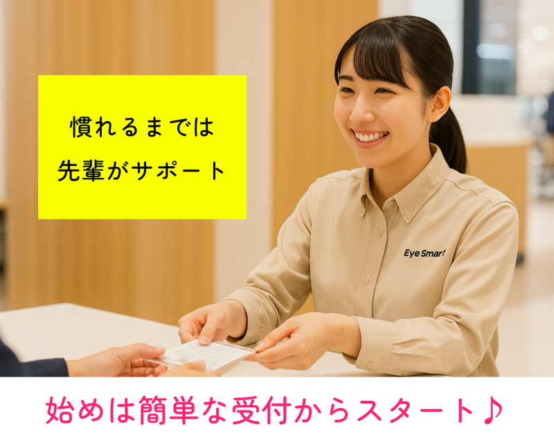 求めている人材 ✨一緒にEyeSmart(アイスマート)で働きませんか?【受付専任スタッフ募集】 ✅シフトについて 土日祝日に出勤できる方、お待ちしています! 1日2時間~、週に2日~OKです。 夕方から閉店19:30まで勤務できる方歓迎! 週に20時間以内ぐらいまでで勤務したい方を募集しています。 ✅学歴・経験不問!未経験者も大歓迎です! お店の「顔」として、お客様を笑顔でお迎えしてくれる方をお待ちしております。 修理の知識やスキルは一切必要ありません✨ ✅接客経験者も、もちろん歓迎! アパレルや飲食など、他業種での接客経験も活かせます! あなたのコミュニケーション能力を発揮してください✨ ✅お仕事内容について 私たちの仕事は、ただの受付ではありません。 「スマホを落として画面が…」「急に電源が…」 お客様は様々な不安を抱えてご来店されます。 お客様一人ひとりのお話をじっくり伺い、状況に合わせた最適なご案内をする、とても大切でやりがいのあるお仕事です。マニュアル通りの対応だけでなく、あなたの言葉で提案することが、お客様の「ありがとう」に繋がります⭐ お客様との会話を楽しみながら、その場に応じた柔軟な対応ができる方を求めています! ✅ファッションについて 髪型、髪色、ネイルは基本自由です✨ (お客様に安心感を与えられる範囲で、あなたらしいオシャレを楽しんでください!) <先輩スタッフからの一言> お客様の「困った」というお気持ちに寄り添える方なら、きっと活躍できます!専門知識は働きながら少しずつ覚えられますし、何より大切なのは「お客様のために何ができるか」を考える気持ちです。人と話すのが好きな方には、毎日が新鮮でとても楽しい職場ですよ!