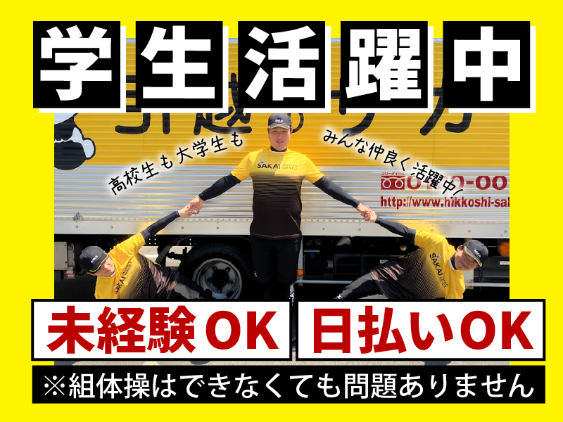 仕事内容 ✅海外へのお引越しのサポート! #友達同士の応募OK #バイトデビューならサカイで決まり! #高時給1375円~ #少ないシフトでも高収入! #完全自己申告シフト #週1日~OK #単発・短期もOK #社員登用制度で大手企業の正社員も目指せる ✅どんなお仕事? 顧客宅での梱包・仕分け・引越サポート! 大きな家具は社員が対応するので、 通常の引越作業より、 運搬は少なめ!負担も少なめ! 梱包・仕分け作業がメインです! 遠方への引越しになるので、 破損しないように 丁寧に梱包材を巻いたり、 ダンボールに詰めていきます! ✅自分の都合で働ける♪ 「月4~5回」 「週1日のみ」 「土日のみ」など、 シフトは自由に決めてOK! 「テスト週は勉強に集中したいから週0日」 「夏休み期間だけガッツリ週5日!」 「初バイトで不安だから まずは週2日から慣れたい」 どんな働き方も叶います✨