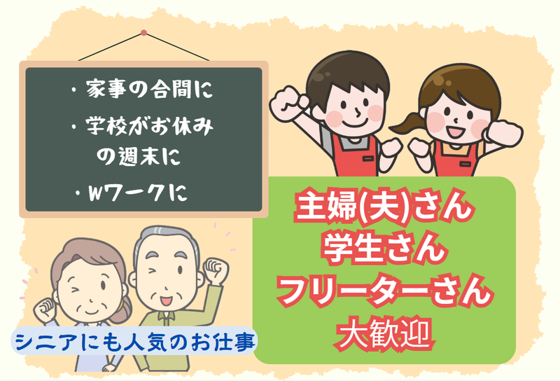 求めている人材 未経験者大歓迎! 家事や子育てと両立する主婦(夫)さん 他のバイトとうまく調整して働きたいWワークさん ここだけでしっかり稼ぎたいフリーターさんも応援します。