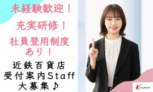 仕事情報 ● 仕事内容 あべのハルカス近鉄本店でのお仕事。店内案内、ベビーカー・車 椅子の貸出し、駐車優待、領収証の発行、緊急時の対応等をお願 いします。 【0001】 【0002】 社員登用制度あり ●未経験歓迎!●接客好きな方大歓迎充実した研修がありますので安心してご勤務が可能♪社員登用制度があるのでスキルアップしたい方是非チャレンジしてださいね。 オンライン面接実施中♪ 【オンライン(Web)で面接を実施しております】アプリのインストールは不要。スマホやパソコンでOK!外出せず家に居ながら面接が受けれます。面接も交通費掛からずok!お仕事時も交通費支給で無駄な出費いらず♪お気軽にご応募くださいね。 近鉄HRパートナーズとは 近鉄グループの旅行関連人材会社の株式会社ツーリストエキスパーツと百貨店・流通関連の人材会社である株式会社Kサポートは経営統合し2024年10月1日に発足しました。これからも近鉄グループの一員として人材派遣・業務請負・人材紹介を通じて多様なニーズに応え企業や組織の成長を支える総合的な人材サービスを提供します。 お仕事NO 10749