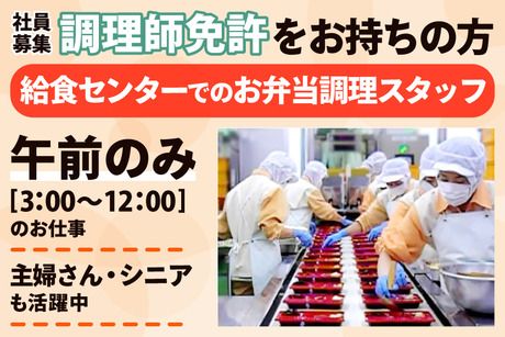 仕事内容 <調理・調理補助>難しい作業はないので、安心してくださいね。 給食センターで、お弁当の調理・盛り付け、食器・調理器具の洗浄などおまかせします。すぐに働きたい方も大歓迎!未経験から安心してスタートできる、シンプルでやりがいのあるお仕事です。 「調理師」の資格を活かしません?即戦力のある資格をお持ちの方を募集します。 実務経験は問いません!資格を取得したものの「現場は初めて」という方も大歓迎です。ブランクのある方も心配ありません。資格を活かして、やりがいのある仕事の幅を広げていきましょう! プライベートを大切にしながら働きたい方にもオススメ。自分らしく働きましょう! プライベートの予定が立てやすいのが魅力です。家族との時間や友人との交流、趣味を楽しんでしっかりリフレッシュ!メリハリつけて働けます。 困った時は互いに助け合う環境です。スタッフ同士仲が良く、みんなで和気あいあい、楽しく働いています。 少人数で切り盛りしている職場だから、すぐに名前と顔を覚えられます。気さくで面倒見の良いスタッフばかりのアットホームな雰囲気なんです。みんな新しい仲間が加わってくれることを心待ちにしています! 当社は創業以来、給食が経営基盤。景気動向に左右されることなく堅実な企業としての発展を続けています。 現代人の需要に合わせて、食材や栄養バランス、衛生管理等にも配慮した体制のもと、商品提供を行っています。また、地域に愛される企業として地域貢献も行っています。