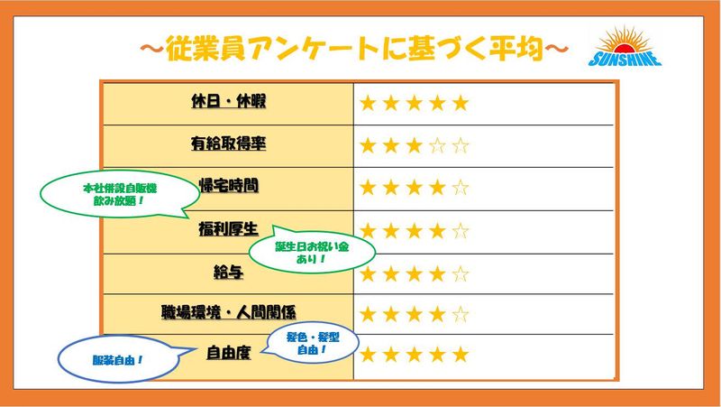 求めている人材 ⭐求める人物像 ───────── 以下、「1つ」でもあてはまっていればOKです! ✅居宅介護の経験者 ✅訪問介護の経験者 ✅初任者研修以上の資格保持者 ※有資格者は歓迎します! <こんな方も歓迎!> ・障がい福祉の課題を解決したい方 ・やりがいのある職場で自分らしく働きたい方 ・充実した待遇の場所で働きたい方 ・安定した場所で働きたい方 \\社内アンケート調査より// 休日・休暇★★★★★5 有給取得率★★★☆☆3 福利厚生★★★★☆4 帰宅時間★★★★☆4 定着率★★★☆☆3 給与★★★★☆4 安定★★★☆☆3 職場環境・人間関係★★★★☆4 スキルアップ・資格取得★★★★☆4 髪型や髪色、服装等の自由度★★★★★5 施設の清潔さ★★★★☆4 人事評価・昇給・のびしろ★★★★★5 独立応援度★★★★☆4 提案の実現度★★★★☆4 ※従業員アンケートに基づく平均(2024年8月)