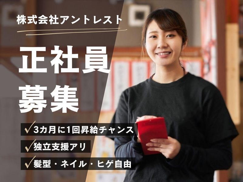 仕事内容 ★゜・。・゜☆゜・。・゜★゜・。・゜☆ <<店長候補募集×成長企業アントレスト>> 「“温かいバトン”を街へ届ける仲間を募集します!」 ★゜・。・゜☆゜・。・゜★゜・。・゜☆ \アントレストで働くポイント/ ★ 経験より“人の温かさ”を大切にする会社 ★ 店長へのキャリアアップが最短距離 ★ 週休2日/各種手当・福利厚生が充実 ★ 髪色・ピアス・ネイル・ヒゲOKの自由な社風 ★ BBQ・スポーツ・生産者訪問などイベント多数 ★ 理念「PASS THE HOT BATON」に共感できる方歓迎 ································ 【仕事内容】 店長候補として店舗運営業務をお任せします。 【具体的には…】 ◆接客・調理の基本オペレーション ◆スタッフ育成・シフト管理 ◆売上管理・FL管理 ◆店舗づくりに関する改善提案 など まずは現場でお客様との距離感や接客のスタイルを学び、 徐々にマネジメントへステップアップしていただきます。 アントレストの特徴は「素の優しさ」を活かす接客。 大きな声やテンプレート接客ではなく、 “あなたらしい気遣い”でお客様をあたためてください。 ································ 【アントレストってこんな会社!】 〜理念「PASS THE HOT BATON」〜 アントレストは「温かいバトンを街へつなぐ」ことを理念に掲げ、 美味しい料理・快適な空間・気遣いあるサービスを通じて、 “少し気持ちが温かくなる瞬間”を生み出す会社です。 ◆ 社名の由来 entrest= ・アントレプレナー(起業家) ・レストラン ・EST(最上級) を掛け合わせた造語。 「飲食で最高の起業家集団になろう」という想いが込められています。 ◆ 誕生ストーリー 代表は幼い頃から“起業”に憧れを持ち、 東京でのベンチャー経験・仲間との出会いを経て飲食での創業を決意。 おしゃれな店ではなく“地域に必要とされる店づくり”を行ってきました。 ◆ MISSION アントレストでは、 「お店は街へのプレゼント」 「料理はお客様へのプレゼント」 「賄いは仲間へのプレゼント」 という想いを大切にしています。 誰かを喜ばせるために働く── その考え方がすべてのサービスの根底にあります。 賄いは単なる食事ではなく“学びや経験というプレゼント”でもあり、 仲間同士が自然に支え合える温かい文化を育てています。 社長=校長先生 店長=担任の先生 と思っていただいて構いません。 スタッフ一人ひとりの人生に寄り添う存在でありたい、 という独自の教育観を持っています。 店長はスタッフにとって身近な存在であり、 日々の関わりが“その人の未来の価値観を左右する”と本気で考えています。 だからこそ、怒るのではなく、愛情を持って叱り寄り添い、押しつけるのではなく気づきを与える。 “温かい先生”が多い組織だから、自然と優しい空気が広がります。 この文化が、 アントレストが大切にする「PASS THE HOT BATON」── 温かさのバトンをつなぐ理念と深く結びついています。 ◆ VISION 「あたたかい人 → あたたかい店 → あたたかい街」へ 社員もアルバイトも理念カードを携帯し、日報で理念を共有しています。 その積み重ねにより、 “どう行動すべきか”ではなく “どうしたら相手が喜ぶか”を自然に考えられるスタッフが育ちます。 この小さな温かさの連鎖こそ、 アントレストが街にもたらしたい価値であり、 働く人たちの誇りでもあります。 ································ 【ここが魅力!】 ◆ キャリアアップが明確 一般社員 → 副主任 → 副店長 → 店長 → マネージャー 最短距離で成長できる評価制度を整備。 ◆ 温かく自由な社風 元気な声より、“素の優しさ”を大切にする接客方針。 髪色・ネイル・ピアス・ヒゲOKで個性を活かせます。 ◆ イベント多数で仲が良い 野球・バスケ・フットサル、 醸造所などの生産者訪問、 月1の店舗飲み会(3,000円会社補助)など。 ································ 【働くお店:山本牛臓】 名物の焼きもつ鍋 (牛蔵ホルモンチョンゴル) や チーズタッカルビをはじめ、 韓国の定番料理を 日本人好みの味付けで提供する 人気の韓国料理店です。 80cmの和牛ホルモンを 目の前でカットするド迫力な パフォーマンスも魅力な他、 ドリンクの種類も豊富。 賑やかな宴会や飲み会に ぴったりの居酒屋空間で、 肩肘張らずに韓国料理を 満喫できるのもファンから 支持される理由のひとつです。 友人同士や会社帰りの グループ利用が多く、 幅広い客層にご利用 いただいております。 ································ \働くうえでのポイントはこちら/ 【働きやすさを支える“充実の休暇制度”】 アントレストでは、社員のプライベートも大切にしています。 週休2日/年間休日106日 に加え、 夏季休暇・冬季休暇・バースデー休暇・ハネムーン休暇・有給休暇 など、 家族や友人との時間、自分のための時間をしっかり確保できる環境です。 【生活を支える“手厚い手当”が魅力】 社員の生活基盤をし