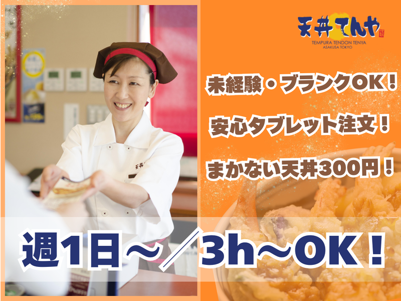 求めている人材 ✅ 未経験者大歓迎! ✅ 主婦さん活躍中! 子育てと両立する方や 子育てが一段落した方など様々! ✅ フリーター歓迎 ✅ WワークOK ✅ 扶養内勤務OK <✅こんな方にピッタリ> ⭐人と話すことが好きな方 ⭐明るい挨拶が自然にできる方 ⭐お客様の「ありがとう」がやりがいになる方 ⭐チームで協力しながら働くのが好きな方 ⭐接客業に興味がある・経験を活かしたい方 ⭐初めてのことにも前向きにチャレンジできる方 ⭐コツコツ丁寧に仕事ができる方 ⭐気配りや心配りが自然にできる方 ⭐空いた時間を有効に使いたいと考えている方 ⭐美味しいごはんが好き、天丼が好きな方