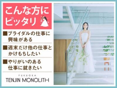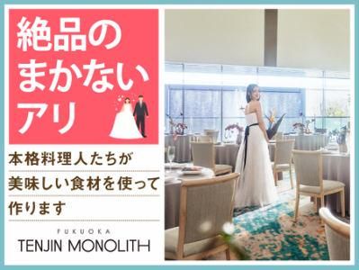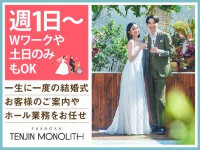 仕事内容 *純白のチャペルがある都会的なブライダル会場* 感動いっぱいの結婚式を一緒にサポート♪ 週1~の柔軟シフトでWワーク・副業OK! フリーターさんも大歓迎♪ 「人が喜ぶ姿が好き」「サプライズが好き」 という方必見!スキルや経験は一切不要♪ 一緒に素敵な結婚式を演出しましょう* 天神モノリスは 水面に浮かぶ純白のチャペルと 水や光の演出が美しい結婚式場。 ウェディングのお手伝いをするお仕事です◎ <主なお仕事内容は…> 結婚式場スタッフとして 次のお仕事をお任せ! ■会場の準備 ■お客様の上着や荷物のお預かり ■お席のご案内 ■結婚式のお料理・ドリンク提供 ※キッチン業務はありません◎ ―――――――――――――――― 学生さん・Wワーク希望の方に オススメのポイントはこちら★★ ―――――――――――――――― ・頑張りをしっかり評価する環境! ・絶品のまかないアリ(^^) ・週1日~1日4時間~OKで融通◎ ・本業が休みの土日だけ等大歓迎! ・かけもち・副業OK! まかないは本格料理人たちが 美味しい食材を使って作ってくれます♪♪ 現在はアルバイト・パート15名が在籍中! 10代20代中心で、学生さんや Wワーク・かけもちで働くスタッフが多数★ フリーターも2名在籍しています! (男女比:男性4:女性6) 社員は20代~40代の20名が在籍中! 基本的には社員4人+アルバイト10名体制で 営業しており、サポート体制は抜群! ―――――――――――――――― 特別な1日をサポートするお仕事 具体的な仕事の流れは? ―――――――――――――――― ▶STEP.1 ミーティング 披露宴の流れやお料理について スタッフ間で事前に確認して 式中にバタバタしないようにします◎ ▶▶STEP.2 披露宴会場の準備 お席に置く名札や ゲストの方に渡す引き出物を確認したり グラスを磨いたりして準備します。 ▶▶▶STEP.3 お客さまのお出迎え 荷物をお預かりし、 待合室でドリンクをお出しします! ▶▶▶▶STEP.4 ホール業務 お席にご案内し、順番にお料理や ドリンクを提供します◎ ―――――――――――――――― 未経験者歓迎! みんなで助け合う雰囲気です ―――――――――――――――― 最初は結婚式の見学からスタート! 見学後は本番じゃないところで、 研修を実施します◎ 「ブライダル業界は初めて」 「マナーが不安…」 そんな方もご安心ください。 入社時は経験・スキルは一切不問! 不安がなくなるまで、 スタッフ全員でサポートします◎