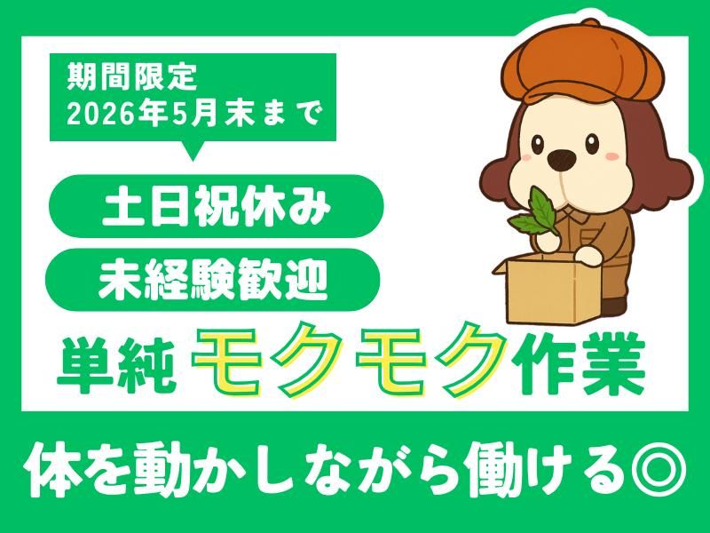 仕事内容 【アピールポイント】 ✅5月末まで限定!エリアトップクラスの高時給1350円! ✅未経験・年齢不問!20代~60代まで幅広く活躍中! ✅土日祝休み&選べる時間帯! ✅モクモク作業が好きな方におすすめ! 【仕事内容】 \2026年5月末までの期間限定!単純作業でしっかり稼げる高時給ワーク!/ 「青汁」などで有名な、健康食品の製造工場でのお仕事です! 大麦若葉やケールなどの原料(葉物野菜)を、生産ラインへ「サラサラ~」と投入するだけの、とってもシンプルな作業をお任せします◎ <具体的なお仕事> *原料が入ったケースを持ち上げ、機械に投入します。 *空になった原料ケースを片付けたり、整理します。 <安心ポイント> ◎作業はずっと一人ではなく、他のスタッフと交代しながら進めます! ◎重量物はありませんが、1日中適度に体を動かすお仕事です! ◎難しい機械操作や専門知識は一切不要!未経験から始めた方ばかりです! ※就業後、仕事内容に変更はありません ///////////////// <電話でのお問い合わせ> *0120-077-170* までお問い合わせください。 ///////////////// ✅5月末まで限定!エリアトップクラスの高時給1350円! ―――――――――――――――― 「次の仕事までのつなぎに」「春までに集中して稼ぎたい」そんな方にピッタリ!時給1350円の高時給で、月収21万円以上も可能です。急な出費に嬉しい「週払い」もOK!(規定あり) ✅未経験・年齢不問!20代~60代まで幅広く活躍中! ―――――――――――――――― 「投入する」だけの単純作業なので、年齢や経験は一切問いません。学生さん、主婦(夫)さん、フリーターさん、シニア世代の方まで、皆さん大歓迎です! ✅土日祝休み&選べる時間帯! ―――――――――――――――― 基本は土日祝休みで、プライベートの予定も立てやすい!勤務時間も「朝から」or「昼から」を選べるので、あなたのライフスタイルに合わせて働けます。 ✅モクモク作業が好きな方に! ―――――――――――――――― 複雑な人間関係や接客は一切なし。自分の担当作業にコツコツ・モクモクと集中できる環境です。