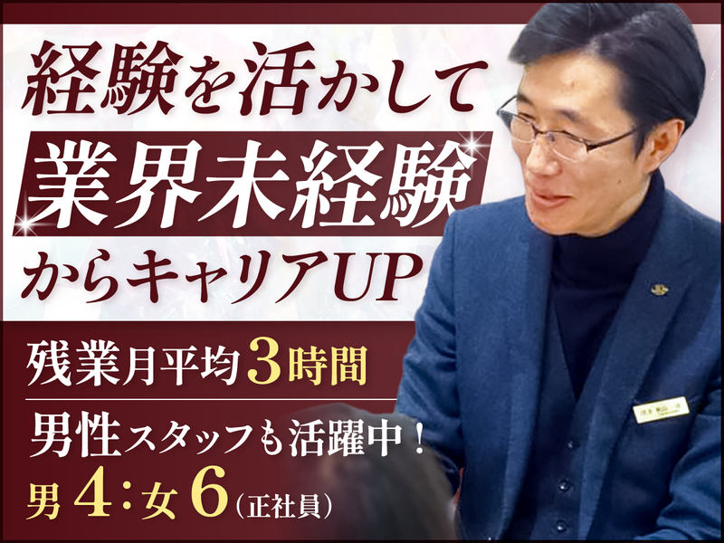 求めている人材 【 必須 】 営業職・販売職いずれかの経験(業界不問) *年齢不問 *ブランクOK・ブランク歓迎 【 こんな方は大歓迎! 】 ・ご自身のスキルを磨きたい方 ・キャリアアップを目指す方 ・初対面の人ともすぐに打ち解けられる方 <こんな経験を活かせます> *宝飾品やブライダルなどに関わる経験 *ブティック販売、自動車販売、 ディーラー営業、住宅営業、保険営業、 エステティシャンなどの営業・販売経験 *ご自身でお客様を担当し、 定期的なご提案をおこなった経験 【 キャリアステップ 】 販売職>副店長>店長>スーパーバイザー 販売を極めたい⽅には、資格取得を⽀援。 また、管理職を⽬指す⽅には店長や スーパーバイザーなど部下の教育や 店舗管理もおこなっていただくなど 個人の意思を尊重したキャリアが可能!