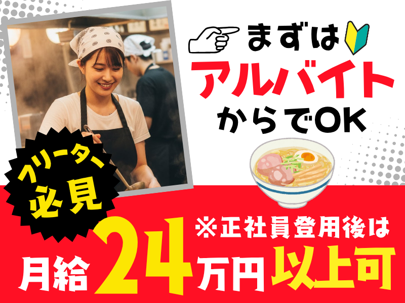 仕事内容 ✨未経験スタート大歓迎✨ ✅履歴書不要で最短3日で採用もOK! ✅天王寺駅から徒歩1分の好立地♪ ✅週2日・3hから1週間毎シフト! ✅正社員登用制度あり(月給24万円以上) スタッフ想いのラーメン店 「らーめん亀王 天王寺駅前店」にて、 ホールキッチンスタッフを募集します! ✨具体的な業務内容✨ ✅ホール業務 ・お客様をお席にご案内 ・ラーメンや料理の配膳 ・レジ業務 ✅キッチン業務 ・簡単な仕込み ・簡単な調理 ・簡単な盛り付け ・洗い場 など 飲食・ラーメン未経験歓迎! 「Wワークで働きたい!」 「正社員を目指したい!」 「ラーメンが好き!」 こんな方も歓迎です♪ ✨入社後の流れ✨ まずは、店長や先輩スタッフが一緒について 業務をお教えしていきます。 メニューは、配膳していると 自然に覚えられるので大丈夫! 当店自慢の豚骨スープの仕込みもお教えしますが、 業務になれてきてからでOKです♪ 困ったことがあれば相談もできる環境です! - ✨フリーターさん必見!✨ 当社は スタッフ平均年齢27.9歳、 若手が多く活躍中! 同世代と一緒に成長できる環境です。 さらに… ✅リーダー昇格まで平均 1.7年 ✅マネージャーまで 3.3年 ✅店長まで 6.4年 とキャリアアップの道筋も明確! 入社後は先輩が丁寧にサポート。 接客・調理補助からスタートし、 リーダー⏩マネージャー⏩店長 とステップアップ! ✨将来の選択肢も豊富✨ ✅独立開業:自分のお店を持ちたい方 ✅本社勤務スーパーバイザー:外食産業のスペシャリストを目指す方 ✅海外事業:海外での仕事に挑戦したい方 ✨生活面も安心✨ 男子寮・女子寮も完備しており、 梅田まで自転車圏内。 通勤も各店舗まで15分〜1時間と便利! 「安定した生活基盤を持ちながら、 将来の夢やキャリアに集中できる環境」 を整えています◎ ✨勤務時間について✨ 9時~24時で週2日、3時間からOK! シフトは1週間ごとに組むので、 先の予定に合わせて働けます。 週5日で働きたい方・フルタイム勤務は優遇! ✨正社員登用制度について✨ アルバイト経験を考慮して決定! 月給24万円~(詳細は面接でご説明します) ✨スタッフインタビュー/20代男性フリーター✨ これまで飲食やコンビニのアルバイトをしてきました。 昔は自分の店を持ちたいと漠然と考えていたのですが、 まずは安定した環境でスキルを磨きたいと思い、 この会社に応募しました! 最初は配膳や仕込みからでしたが、 先輩が丁寧に教えてくれるので 安心して始められました! キャリアアップの道筋が明確で、 頑張り次第でリーダーや店長も目指せる環境なので、 自分の将来像を描きやすいのが魅力です◎ 寮も完備されていて生活の基盤が安定するので、 安心して働きながらキャリアを積めています! ✨履歴書不要で気軽に面接OK✨ 面接には履歴書不要なので 「働いてみたい」と思ったらぜひご連絡ください! あなたの希望する働き方や稼ぎたい金額、 いま不安に思っていることなど 何でもお聞かせくださいね! 一緒に働けることを楽しみにしております♪