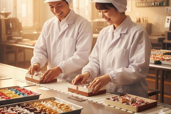 ✅勤務時間:8:00~17:00・夜勤16:50~1:50の(2交代制)✅休日:土・日曜休み ◆函館×”家賃0円”。チョコとキャラメルの箱詰めワーク