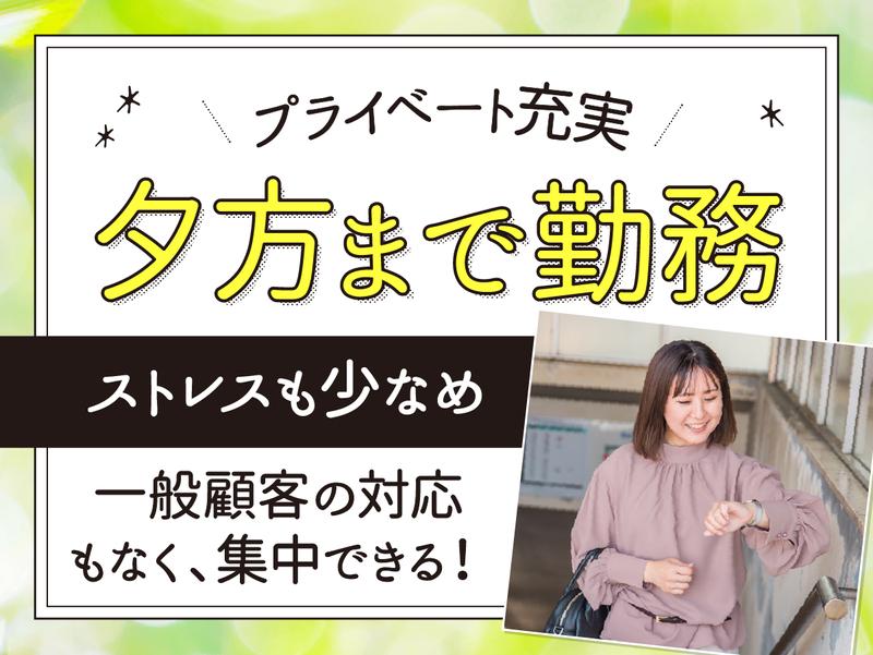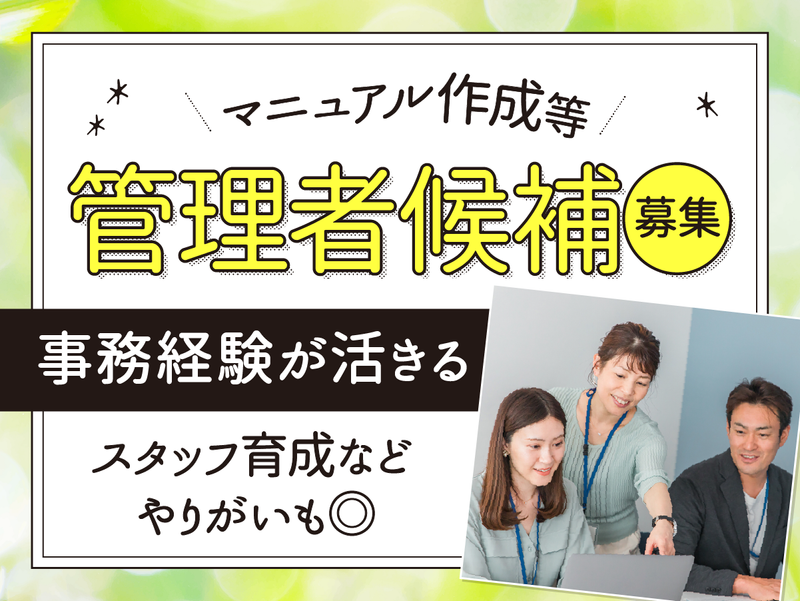 仕事内容 \\新規チームの立ち上げ準備から携わります// *マニュアル作成などパソコン操作を活かせる *土日祝日お休みで年間休日は120日以上! *一般のお客様に対するお電話対応はナシ◎ *夕方までの勤務でプライベート時間も充実可能♪ 【仕事内容】 大手生命保険会社の事務センターにて管理者候補の業務をお任せします。 ―具体的には― 〇新規チームの構築準備: 業務開始に向けた体制づくりやマニュアル作成などを行っていただきます。 〇スタッフのサポート業務: 業務開始後はスタッフの育成や指導、進捗の管理などをお任せします。 〇クライアントとの連携: 業務を円滑に進めるためのクライアント対応もご担当いただきます。 <スタッフの業務内容> 各自治体(税務署や市役所など)からの文書やメールによる契約内容の問合せに対し、メール等で回答する業務です。一般のお客様との電話対応はありません。 ー入社後の流れー 4月1日より導入研修を実施し、基礎からしっかりと学んでいただきます。2日目以降は業務の構築進捗に合わせて随時レクチャーを行いますので、着実にステップアップが可能です! ー‥*。 【入社日】 4/1(水) 【研修】 4/1(水)の1日間 9:00~17:00(実働7時間) ※初回は研修導入、基礎研修を実施します。 2日目以降は、業務構築の進捗に合わせ必要に応じて随時研修を行います。 ー‥*。 【大手生命保険会社にて新業務がスタート】 今回は新規立ち上げのため、チームの構築準備から携わっていただく重要なポジションです。ゼロから作り上げる達成感を味わいながら働ける魅力的な環境ですよ◎ 【これまでの事務経験が活きる!】 ExcelやPowerPointを用いた業務マニュアルの作成など、お持ちのパソコンスキルを存分に活かせるお仕事です。これまでに培ってきた事務処理能力や資料作成のスキルを発揮し、チームの基盤を支えてください! 【一般顧客の対応なしで集中できる】 税務署や市役所など各自治体からの問合せにメール等で回答する業務の管理が中心です。一般のお客様との電話対応は発生しないため、スタッフのサポートや進捗管理などの管理者候補としての業務に集中いただけます。 【プライベートとの両立も◎】 土日祝日は完全にお休みで、年末年始の休暇もしっかり取得可能です。平日のみ、かつ夕方までの勤務シフトとなっているため、お休みの予定も立てやすく、仕事とプライベートの時間を無理なく両立させることができます*。 【充実の福利厚生をご用意】 昇給制度や管理者登用後の手当支給など、頑張りをしっかり評価する体制が整っています。また、国内外の宿泊施設やレジャー施設などが最大65%オフで利用できる優待サービスもあり、オフの日も満喫できます。