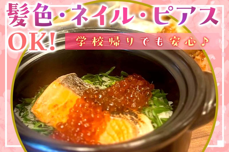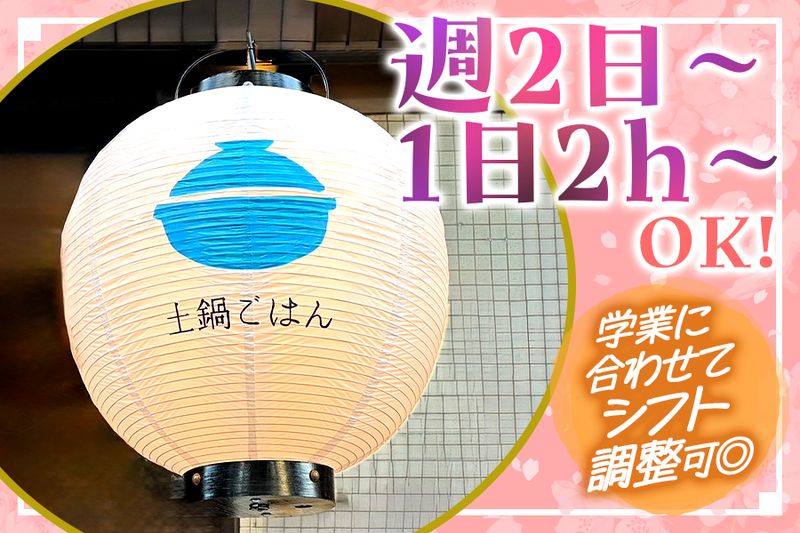 アピールポイント: ✅未経験の方でも大歓迎!  ̄ ̄ ̄ ̄ ̄ ̄ ̄ ̄ ̄ ̄ ̄ ̄ ̄ 飲食店が未経験の方でも安心できるよう、 先輩スタッフが丁寧に教えます! 困ったときはいつでも相談して大丈夫です◎ ✅髪色・ネイル・ピアスOK!  ̄ ̄ ̄ ̄ ̄ ̄ ̄ ̄ ̄ ̄ ̄ ̄ ̄ ̄ オシャレ自由×清潔感はしっかり重視。 メリハリを大切にできる方歓迎! 学校帰りや授業の空きコマでもスグ働けて、 普段のスタイルを変える必要なし! ※詳細は面接時にご質問ください♪ ✅私生活と両立しやすい!  ̄ ̄ ̄ ̄ ̄ ̄ ̄ ̄ ̄ ̄ ̄ ̄ ̄ 週2日・1日2時間から勤務OK! 学生さんにとっても続けやすいシフトです! もちろん、テスト期間やサークル等の予定にも 柔軟に対応していますよ♪ ✅こだわりの和食!まかない無料♪  ̄ ̄ ̄ ̄ ̄ ̄ ̄ ̄ ̄ ̄ ̄ ̄ ̄ ̄ ̄ ̄ ̄ 月替わり定食や土鍋ごはんなど、 お店自慢のメニューを無料で提供! しっかり食べられて節約にもなるから、 働く楽しみのひとつとして好評です♪ ━━━━━━━━━━━━━━━━━━━━