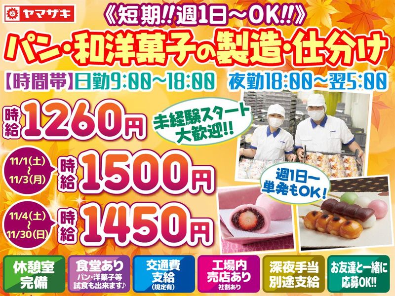 仕事内容 *・・・*・・・*・・・*・・・*・・・*・・・* 《短期スタッフ募集!!》 決まった作業を決まった手順で◎ そんなシンプル作業が中心です♪ 先輩が丁寧にサポートしていきます! *・・・*・・・*・・・*・・・*・・・*・・・* 《⭐期間限定時給で稼ぎも◎⭐》  ̄ ̄ ̄ ̄ ̄ ̄ ̄ ̄ ̄ ̄ ̄ ̄ ̄ ̄ ̄ ̄ 下記期間は「時給1450円~1650円」 ⏩11/1(土)~12/31(水) ※詳細は給与欄参照 ※短期アルバイトスタッフのみ ★創業70年以上!! 有名な食パンや菓子パンなどを 食卓にお届けするお仕事です♪ スーパーやコンビニでお馴染みの 食パン・菓子パン・調理パンや和洋菓子、 おにぎりetc… 様々な製品を日々製造しています。 扱う数は約1200種類、 1日の製造数は約3000万個!! 仕込み→成型→焼成の製造工程を経て、 包装して仕分け作業に入ります。 仕事内容も多岐にわたるので 飽きることなく働けます♪ =============== 《交通アクセス》 小平駅より徒歩14分! ⭐バイク・自転車通勤OK! 萩山駅、久米川駅、青海街道駅、 八坂駅、花小金井駅、新小平駅、 一橋学園駅、東村山駅、小川駅、 国分寺駅、田無駅、東久留米駅 …などからもアクセス便利◎ =============== 《応募後の流れ》 応募→説明会・面接→勤務スタート! 応募後、説明会を行い面接を実施します。 【勤務地・面接地までの行き方】 「小平駅」北口より徒歩3分のバス停から ぶるべー号に乗車→ 大沼地域センター公園、下車徒歩5分 当日はラフな格好でOK! 1~2時間程度で終了します。 面接前に聞きたいことなどございましたら、 お気軽にお問い合わせ下さい♪ ※応募書類の返却はしておりません。 =============== ■実際に働いているスタッフの声■ 好きな日にちにシフトを入れられるので 自分の都合に合わせて働けるのが とても助かっています♪ 作業も簡単で気楽ですし、 食堂も363円~と安いので効率良く稼げます。 隙間時間で働けるので、 気づいたら長年働いていた! という方も沢山いらっしゃいます。