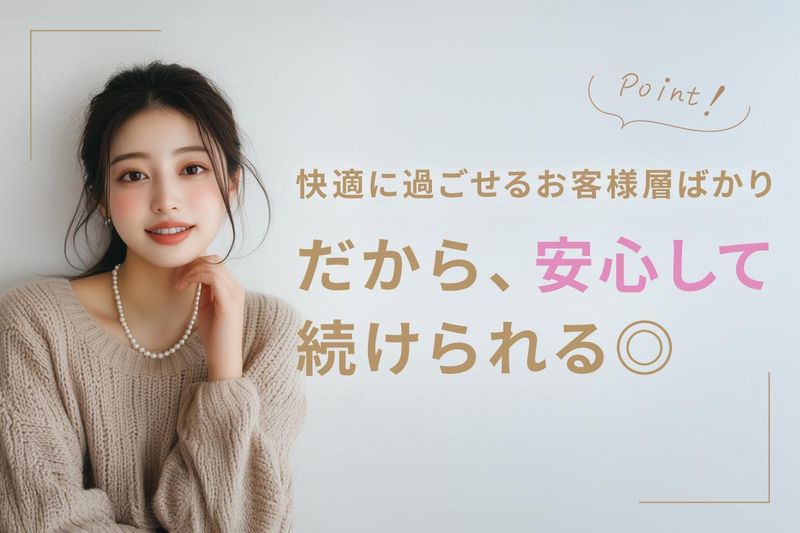職場環境 【女性スタッフ多数在籍の職場】 元キャストの女性社長をはじめ スタッフは大部分が女性! 悩みを相談しやすい職場◎ 清潔感あるお店です! 未経験者も多数活躍! 雰囲気チェックだけの応募もOK! まずは気軽にご連絡ください♪