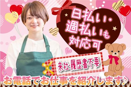 仕事内容 ■百貨店催事場でレジ・販売・商品補充のお仕事 毎年大人気♪バレンタインミュージアムで販売のお仕事! しっかり事前研修があるので未経験、お仕事復帰の方も安心◎ <主なお仕事内容> ・バレンタイン商品の販売 ・商品の陳列補充 ・配送手配 など 商品はラッピングされているので包装業務はありません。 袋に入れてお渡しするだけの簡単作業です。 お仕事初日からすぐに慣れますよ◎ 分からないことや困ったことがあっても大丈夫! 周りのスタッフがしっかりフォローします♪ 有名ブランドチョコやかわいいチョコなど 様々な商品に囲まれてお仕事できます! イベントやお祭りなど、にぎやかな雰囲気が好きな方にピッタリです。 ■毎年、幅広い年代の方が活躍中! 子育て中の方、家事と両立して頑張る方、 目標に向けてお金を貯めているフリーターの方など多数活躍中! 未経験・ブランクのある方でも、最初に丁寧な研修を行いますので 安心してスタートしていただけますよ◎ 百貨店内でのお仕事なので お仕事帰りに夕飯のおかずや生活用品などのお買い物もできて便利♪ ■1/29~2/14までの期間限定!希望の勤務時間の相談もOK♪ 人気の短期のお仕事♪ 「次のお仕事までの繋ぎに」 「学校卒業に向けて時間に余裕がある」 「新生活に向けて稼ぎたい」 など…どんな理由でも大歓迎! 【9:40~19:50】の間で実働6h! 「午前中から夕方まで」 「午後から働く!」 など、時間相談OK! 希望の働き方ができるので、 家庭やWワークとも両立しやすいです★ ■未経験スタート応援!今なら来社&履歴書も不要です! 当社はあなたの新しいお仕事スタートを全力で応援します! 今回募集しているお仕事に関して もっと詳しく説明してほしいと思われた方には、お電話でしっかり説明します。 来社&履歴書不要でお仕事のご案内が可能なので 仕事が休みの日や仕事終わりなど、 あなたの都合のよいタイミングで連絡いただければ希望のお仕事を案内します
