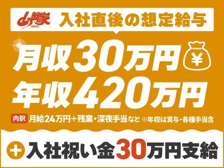 仕事内容 \飲食業界未経験の方も、経験者も活躍中!/ 東証スタンダード上場企業の安定基盤で、 30~40代での入社実績も多数!! 経験に関係なく、安心してキャリアを築けます。 / そんな山岡家だからこそ「働きやすさと やりがいを両立できる職場」との声が続出!! \ ◆入社3年目・アドバンス社員・30代男性 みなし残業なしで、残業代は1分単位。 仕事は動画や冊子のマニュアルで学べるので、 育成のバラつきがなく安心して始められます! ネギの切り方やチャーシューの仕込みなど、 スキルを習得するたび給与がUPするのも魅力! ◆入社2年目・一般社員・30代男性 飲食業界でも機械化が進む中で、 山岡家ではスープもチャーシューも手作り。 お客様の顔が見えるオープンキッチンで、 『ごちそうさま』の声が励みになります! ====================== << ここがポイント! >> ■今なら!入社祝い金30万円支給!! ■残業代は1分単位で全額支給(みなし残業なし) ■昇給・賞与は年2回!! ■特別休暇を合わせて、実質年休111日! ■有給平均取得日数7.5日(土日取得もOK!) <さらに、転勤や研修も安心!> *全国への転勤費用・引越し費用は全額会社負担 *異動に伴う帰赴任手当なども全てサポート! *研修中の交通費・宿泊費も会社が全額負担! *もちろん研修中の給与もきちんと支給します ====================== 【お仕事について】 まずはホール業務からスタートし、 店舗全体の流れや雰囲気をつかみます。 その後、キッチン業務や洗い物、 仕込みなども担当していただきます。 <将来的には…> 接客・調理だけでなく、店舗運営など 店舗業務全般をお任せします。 (スタッフ教育、シフト管理、売上・コスト管理など) \\ 段階的に学べるので安心! // ◆冊子のマニュアルや、店舗のタブレットでも 視聴できる動画教材などをご用意。 何を・どの順番で覚えればいいかが明確で、 着実にステップアップできます! ◆全店舗、食券制&設備が整った店内。 丁寧な接客と、スープ・ネギ・チャーシュー すべてを「お店で手作り」にこだわる山岡家の スタイルに集中しやすい環境です! ※接客・マニュアル・動画はすべて日本語です。 << 無理なく続けられる環境あり! >> ★プライベートの都合に配慮したシフト希望休OK ★女性だけでなく、男性社員の育休取得実績あり! ★社員定着率◎!20年以上活躍する社員も在籍! ====================== キャリアアップを目指すタイミングで、 山岡家がしっかりあなたの背中を押します! - 評価制度が明確だから、着実に仕事を覚えて 入社3年目で店長に昇進する社員も多数! ★頑張り次第で、最短1年で店長昇進も可能! - 【昇進例】※3年目で店長の場合 ・入社1年目(一般社員):年収例420万円 ・入社2年目(アドバンス社員):年収例470万円 ・入社3年目(店長):年収例560万円 <異動も “キャリアアップ” のきっかけに!> 週休2日制の正社員には全国転勤がありますが、 「異動=ただの配置換え」ではありません。 新しい環境で視野が広がり、経験の幅も広がることで 昇進・評価につながるチャンスになります! ====================== 【丸千代山岡家について】 全国に190店舗以上のラーメン店を運営中。 売上好調!前年比平均10%以上の成長率! 47都道府県への出店を目指し、新店OPENも続々。 セントラルキッチンを設けず 全店直営&店内手作りにこだわる姿勢で、 根強いファンもたくさんいます! リピート率はなんと75%超え!(自社調べ) <売上高> 186億7600万円(2023年1月期) 264億9400万円(2024年1月期) 345億8500万円(2025年1月期)*前年比130.5%! 《HP》https://www.yamaokaya.com/ 《採用HP》https://recruit.yamaokaya.com/