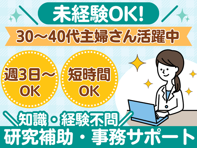 求めている人材 ■未経験歓迎 ■ブランクOK ■特別な資格・専門知識不要 ■30代40代主婦さん活躍中 \ こんな方にピッタリ! / ◎久しぶりの仕事復帰を考えている方 ◎家庭と両立しながら無理なく働きたい方 ◎コツコツ・丁寧な作業が好きな方 ◎ 指示に沿って作業を進められる方 ◎落ち着いた環境で長く働きたい方 【 活かせる経験 】 ☑ 事務作業・PC入力の経験 ☑ 研究補助・軽作業の経験 ☑ 生物/農学/食品/化学系の学科出身の方 ※上記経験がなくても問題ありません