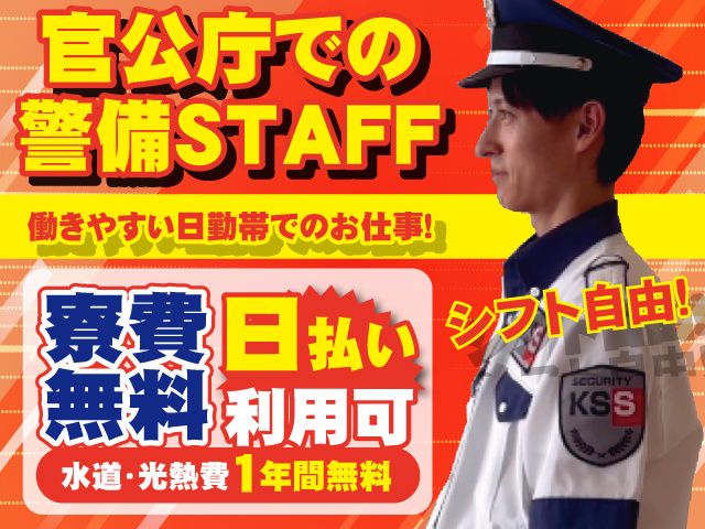 仕事内容 官公庁での施設警備スタッフ 完全室内勤務で快適な環境 安定した日勤シフトで規則正しい生活ができ、 仕事とプライベートの両立も可能です。 日払いOK! "JOBPAY"対応で急な出費も安心! 当社は"JOBPAY"に対応しているので、働いた分のお給料を自分のタイミングでGET可能 入社後に支給される「ジョブペイカード」を使えば、 コンビニ・駅・銀行ATMから24時間いつでも引き出せます! ※当日勤務分は翌日にお支払い可能(規定あり) ※詳しくは面接時にお問い合わせください! 即入居可の社員寮完備! 相場の約半分の「登戸寮」で、生活費を大きく節約できます 家電付き、冷蔵庫、洗濯機、レンジあり その分手取りが増えるので生活も安定◎ さらに、水道・ガス代無料!! 単身赴任もOK◎ 住まいの心配なし!遠方からの応募も大歓迎です。 月収30万以上も可 月収300,000円 ※日給12,000円×25日勤務 資格取得支援など厚待遇◎ 警備デビュー歓迎! 研修などのサポート充実!! 弊社が管理する物件での施設警備をお任せします。 ・出入り管理業務 来館者などの受付対応。 ・巡回業務 施設内外を巡回し、不審者や不審物が無いか、 設備の不備などが無いかを確認します。 ・立哨業務 入り口など、所定の位置に立ち監視する業務。 【未経験者大歓迎】 経験・知識・技能は不問! 販売員・建設業・事務職など、異業種からの転職者も多数! 若手からシニアまで幅広い世代が活躍しています。 年代問わず始められ、安心して働ける環境が当社には整っています。 【会社、そして人がいいから働きやすい】 各種手当が充実しており、頑張りが認めてもらえる環境です。 ・将来的には正社員を目指したい! ・もっと自由に自分のペースで働きたい! ・駅チカ、自宅の近所など希望の勤務地働きたい! ・安定を手に入れたい そんな声にもしっかりお応えできます。 ぜひご応募ください! 【資格取得奨励制度あり】 ・自衛消防技術試験 ・防災センター要員講習・自衛消防業務講習 ・上級救命講習 など警備業で重要な資格をはじめ、 多彩な国家資格・民間資格の受験費を会社が負担。 資格を取得された後は、資格取得手当を支給します。 【共栄セキュリティーサービス株式会社について】 1985年設立。東証スタンダード市場上場。 長年の経験と実績で厚い信頼をいただいており、 景気に左右されない事業基盤が整っています。 商業施設や駐車場、そして工事現場etc… 当社の警備員は、あなたの街の身近な場所、暮らしの安全を支える1人として、 今日も多くの場所で活躍しています。