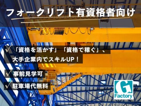 仕事内容 お仕事内容 天井クレーンを使って、原料(金属粉体の入ったフレコンバック約1t)の運搬と機械操作を行います。 そのあとフォークリフトによる原料(金属粉体)の運搬、床上クレーンでの運搬、 加工機の簡単操作や出荷前の計量・荷造り包装も行います。 ※作業に慣れるまで、数日間程度は日勤時間帯での就業になります。 フォークリフト運転資格保有の方、注目です! 好条件でしっかり稼げる アナタの資格を活かしてお仕事が出来ます♪ ★オススメ フォークリフト運転、5t未満クレーン、1t以上玉掛の3資格を活かしたお仕事。 屋根付きの構内での作業中心! フォークリフト資格をお持ちでなければ、入社後働きながら資格取得可能です(費用支援制度あり)。 ここがポイント! ★「資格を活かす」「資格で稼ぐ」、大手企業内でスキルUP! ★事前見学可、駐車場代無料! ★資格取得支援制度あり、寮費全額補助(規定有) ★お給料の仮払い可能!(規定有) ★面接時に履歴書不要!