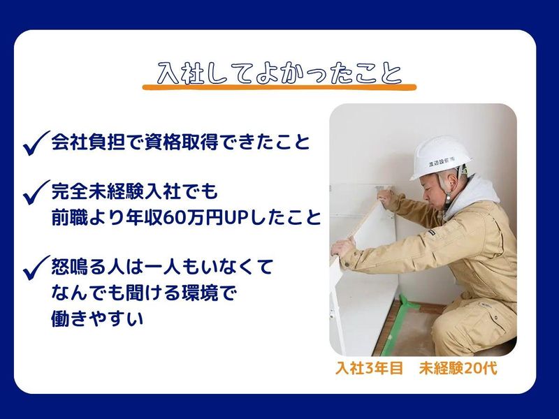 仕事内容 ✅学歴や経験などは一切不問✨ ✅完全未経験の方も月給28円スタート⭐ ✅水道インフラを支える仕事 ✅有給取得率高め⭐残業月8時間程度 【⭐暮らしに欠かせない「水」を支える仕事】 新築戸建て住宅の キッチン・トイレ・お風呂など、 水回りの配管工事を行う仕事です。 普段は当たり前に使っている「水」。 その裏側を支えているのが、私たちの仕事です。 ライフラインに関わるため、景気に左右されにくく、 将来もなくならない安定した仕事です。 現場は岡崎・西尾・蒲郡・幸田エリア中心。 すべて日帰り工事で、泊まり込みはありません。 【⭐未経験でも、ちゃんと収入が上がる環境】 当社の現場スタッフは、 ほぼ全員が未経験スタート。 それでも、 ・入社1年目で月収30万円前後 ・現場社員8名の平均月収は約35万円 ・リーダーになると月収37万円以上 と、成長に合わせて毎年昇給しています。 実際に、 未経験で中途入社し、 今では会社の中核を担う役員まで ステップアップした社員もいます。 「手に職をつけて、安定した収入を得たい」 そんな方には、現実的な道筋がある会社です。 【✅具体的な仕事内容】 現場では、図面を見ながら 水やお湯を運ぶための「配管」を 建物の中に設置していきます。 <仕事の流れ(一例)> ・図面を確認し、配管の位置をチェック ・パイプを必要な長さにカット・加工 ・壁や床に配管を取り付け ・水を流して、漏れがないか最終確認 最初は、 道具の名前を覚えたり、 先輩のサポートからスタート。 必ず2人以上のチーム作業なので、 一人で放置されることはありません。 【⭐渡辺設備のスタッフについて】 現場では21歳〜60代まで、 幅広い年齢層の社員が活躍中。 職人気質で怒鳴るような人はいません。 未経験の気持ちが分かる先輩ばかりなので、 分からないことも気軽に聞けます。 有給も取りやすく、 家族の行事やプライベートも大切にできる環境。 「長く続けたい人」が多い会社です。
