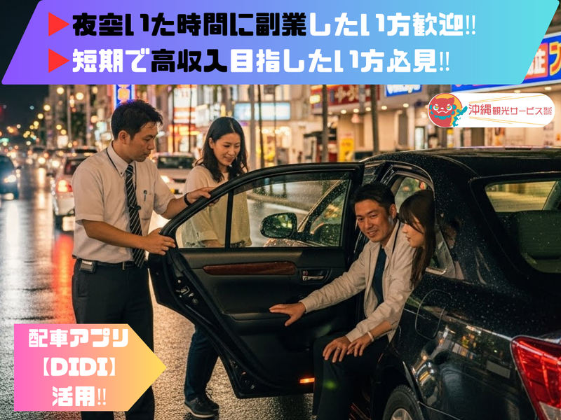 仕事内容 沖縄観光サービス株式会社 が運営する運転代行ドライバー募集‼ 運転が困難になったお客様の車を、 随伴ドライバーと2人1組で 目的地までお届けする運転代行業務です。 【主な仕事内容】 ✅お客様の送迎 ✅同行ドライバー(随伴車)との連携 ✅お客様対応 (乗車時の確認/料金案内/鍵の受け渡し等) 【仕事の流れ】 1.お客様より予約の電話 ※配車アプリも使用 ⇓ 2.指定された場所へ社用車にてお伺い ※2名でお伺いします ⇓ 3.金額などの説明 ⇓ 4.ご指定の目的地まで送迎 ★-★ 1日に数件回っていただきます‼ 完全歩合制で売り上げの 37%をお支払いいたします‼ 【収入イメージ】 ・8時間勤務の場合 売上25,000円 × 37% ⇒ 9,250円/日 ★-★ 【ここがポイント‼】 ・ノルマ無し‼ ・最低保証あり‼ ・配車アプリ 【DIDI】を利用